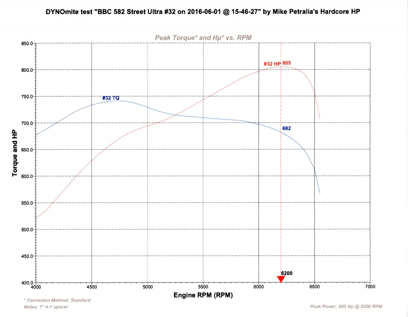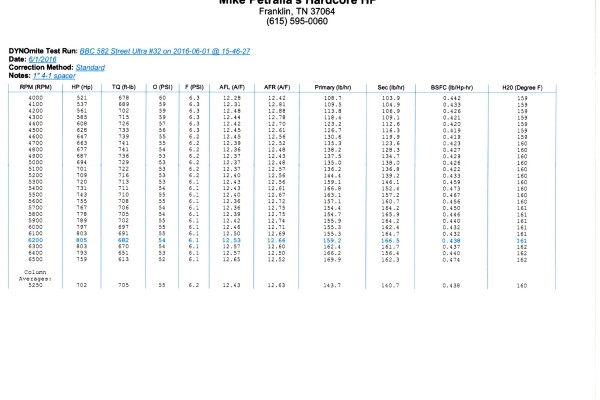 Petralia bolted the 582 to his 2,000 horsepower Land & Sea engine dyno. He used a set of Hooker Super Comp headers with 2.250-inch primaiers and four inch collector extensions. MSD 8.5mm wires deliver spark to Accel spark plugs gapped at .040-inch. A Holley Dominator electric fuel pump, dual filters, and billet regulator provide fuel; the system maintained more than six psi over the entire run up to 6,500 rpm.