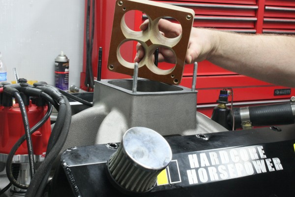 A 1 1/16-inch tall phenolic carb spacer was added to keep carburetor temperatures down and direct the fuel/air mix into the manifold’s long runners. It made for a very tall induction package, but the 582 was going into a car with a six inch cowl hood scoop so it wasn’t a problem.