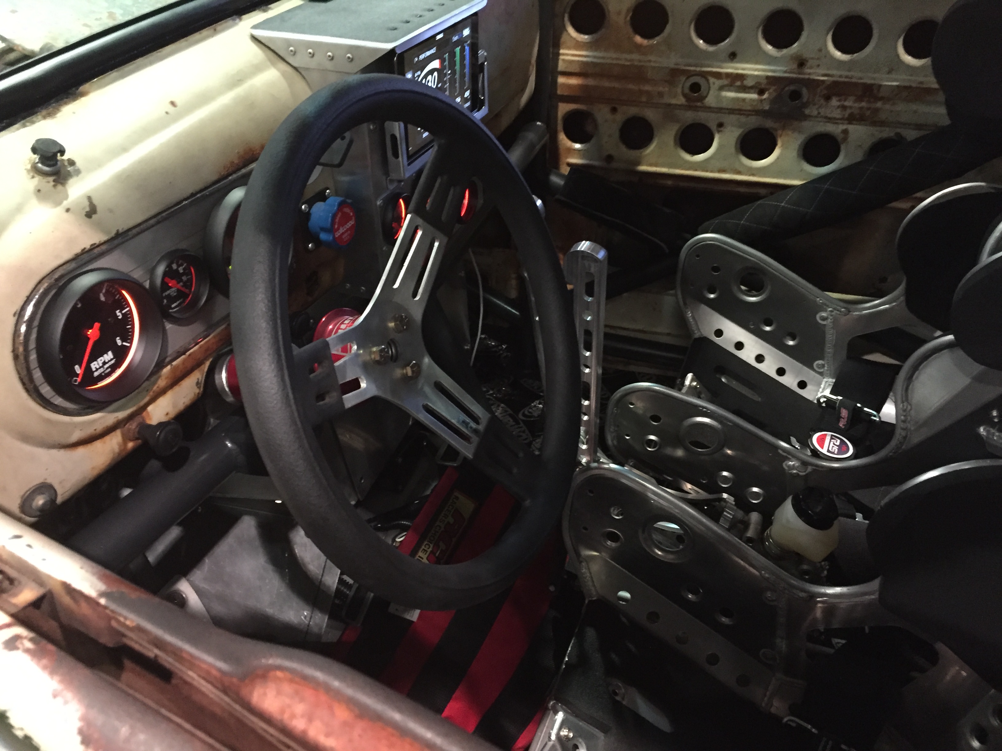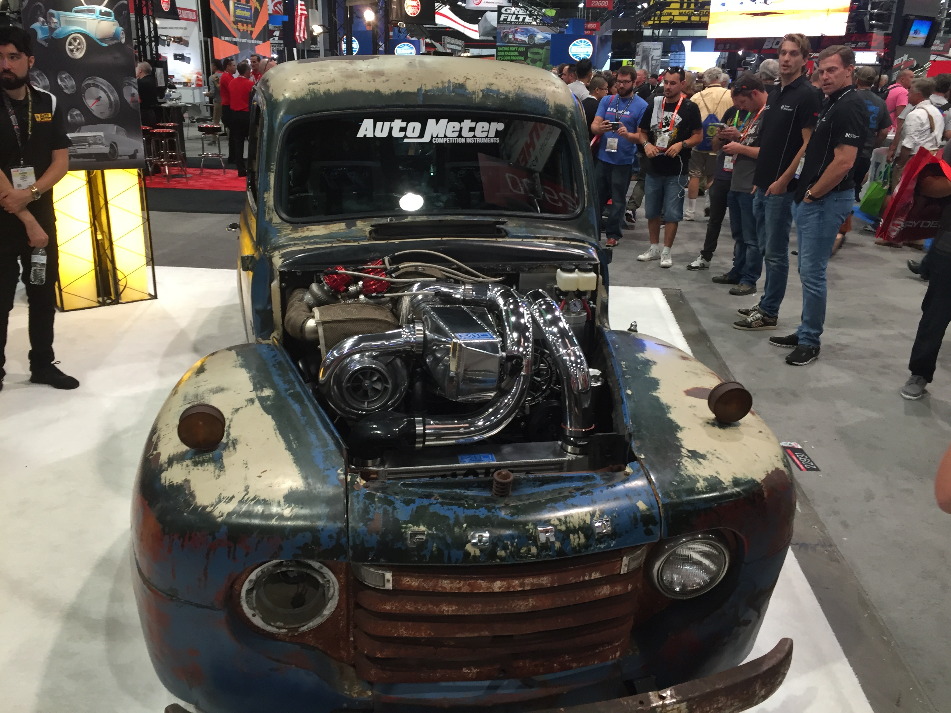 Auto Meter’s Joseph Mills introduced us to Old Smokey and its owner, Scott Birdsall, and then gave us the inside scoop on the Auto Meter products inside. The full tube-frame truck has a 5.9L Cummins plucked from a Freightliner truck. The engine is outfitted with 91mm and 66mm compound turbos that help the transplanted powerplant make 1,200 horsepower and 2,000 ft.-lbs. of torque.