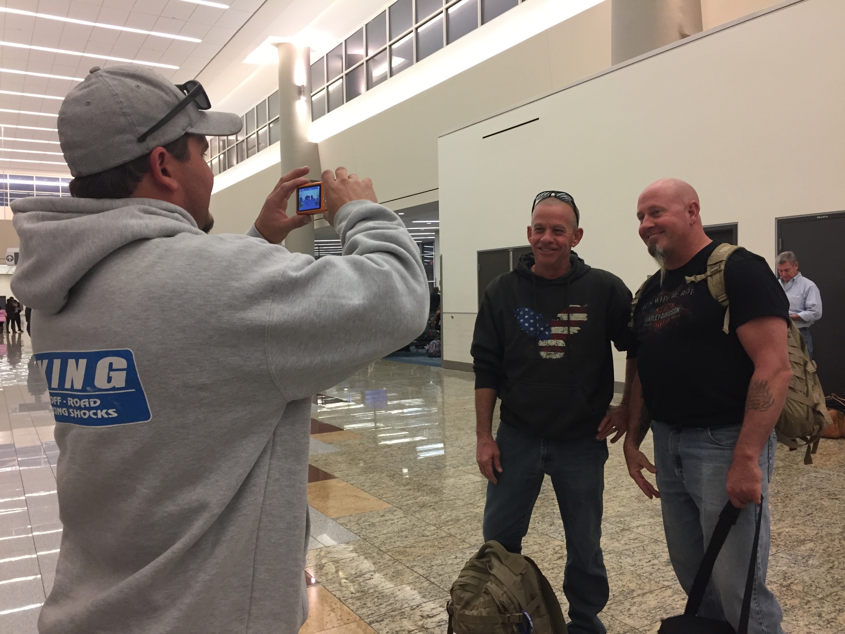 At lunch on Day 1, Jason Line and Greg Anderson meet TSgt. Northrup, a member of Security Forces on temporary assignment at Al Jaber. Northrup shared photos and stories of his Jeep back home, a tricked out rock crawler.