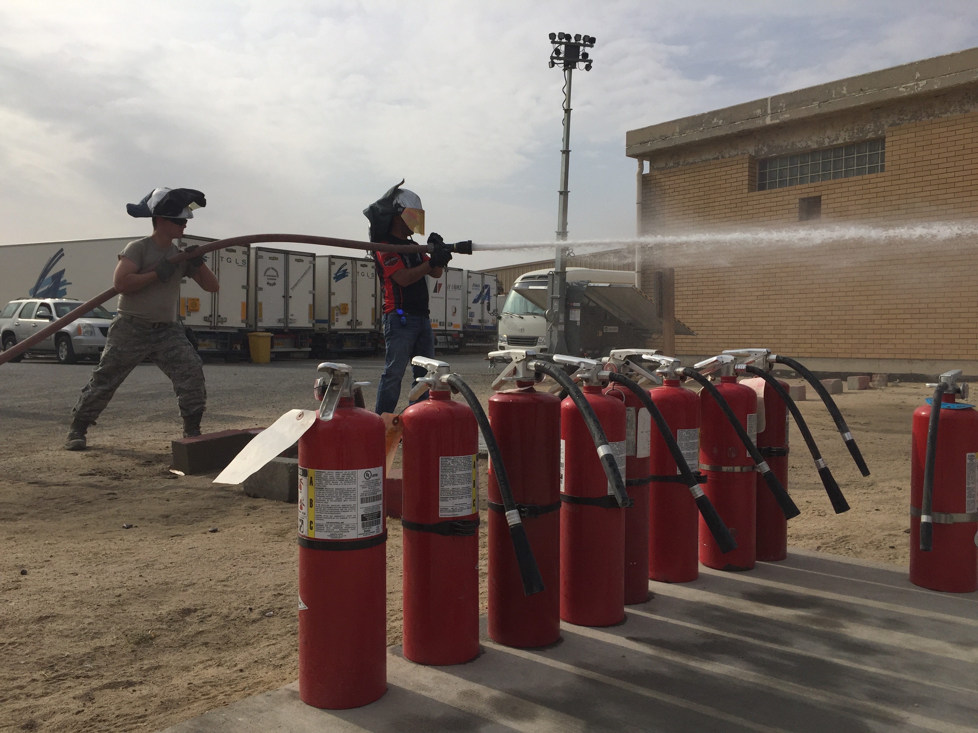 Eddie Krawiec gets some practice with the fire squadron on Al Jaber Air Base in Kuwait.