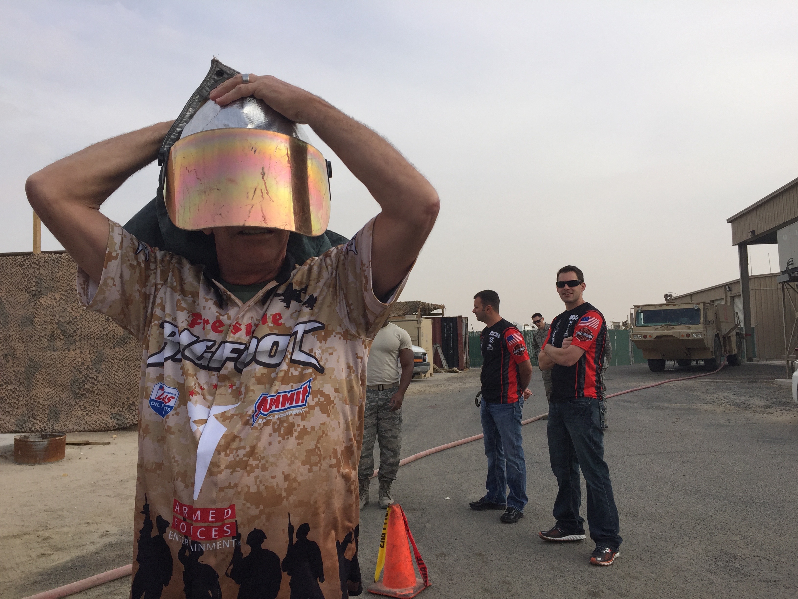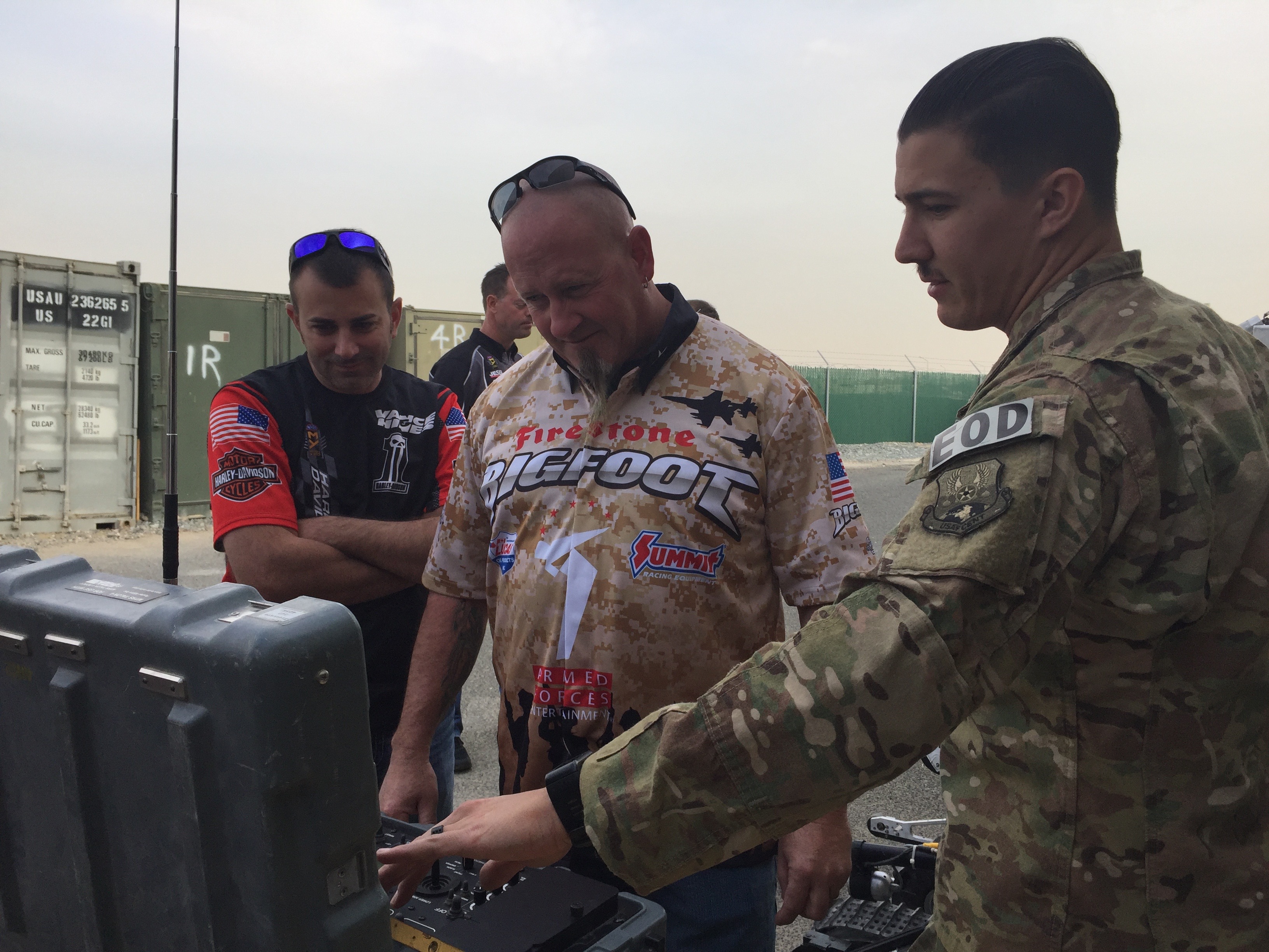 Each day, we get to have lunch at the DFAC [dining facility on base], and today while we were there we got to visit with TSgt. Northrup, a member of the Security Forces who was on his way out the door to get back to work but made a point to stop by our table and say hi to us. He’s your typical hot rodder – you know we’re all very proud of our cars, and he couldn’t wait to show us his. He’s building a street legal rock crawler that looks pretty cool, and he showed us pictures and told us about winning a raffle and getting to crush a car with his Jeep back home. It’s just a cool deal to connect with these folks, and we’re all grateful for the opportunity to do so. I know Armed Forces Entertainment has a lot more planned for us in the days ahead, and we’re pretty pumped about the BIGFOOT shows that will be happening here shortly. It will really be something special to share that with the troops. This trip is a big deal for us, and we’re all grateful to be here.”