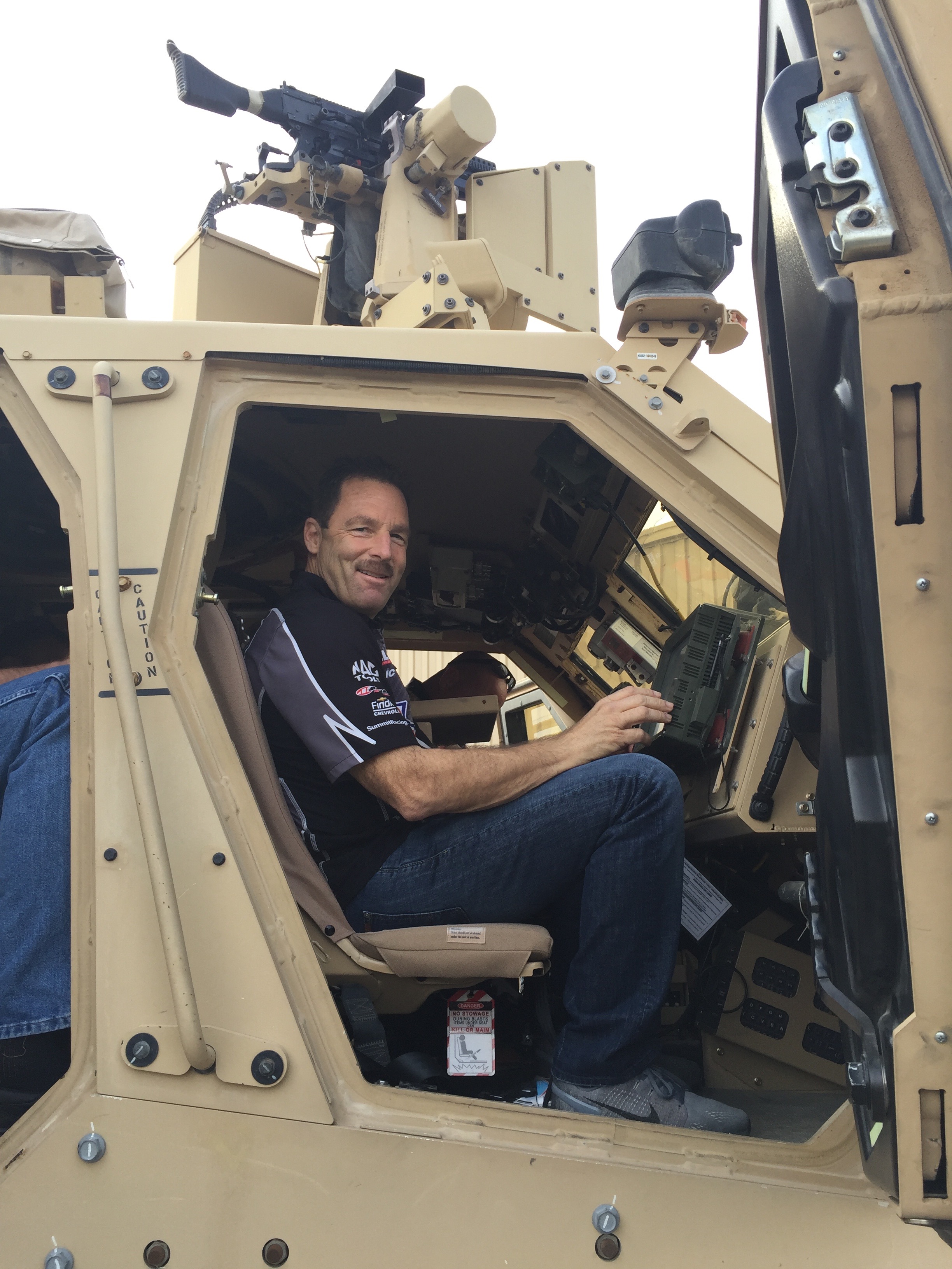Greg Anderson settles into one of EOD’s MAT-Vs, a bomb-resistant all-terrain vehicle.