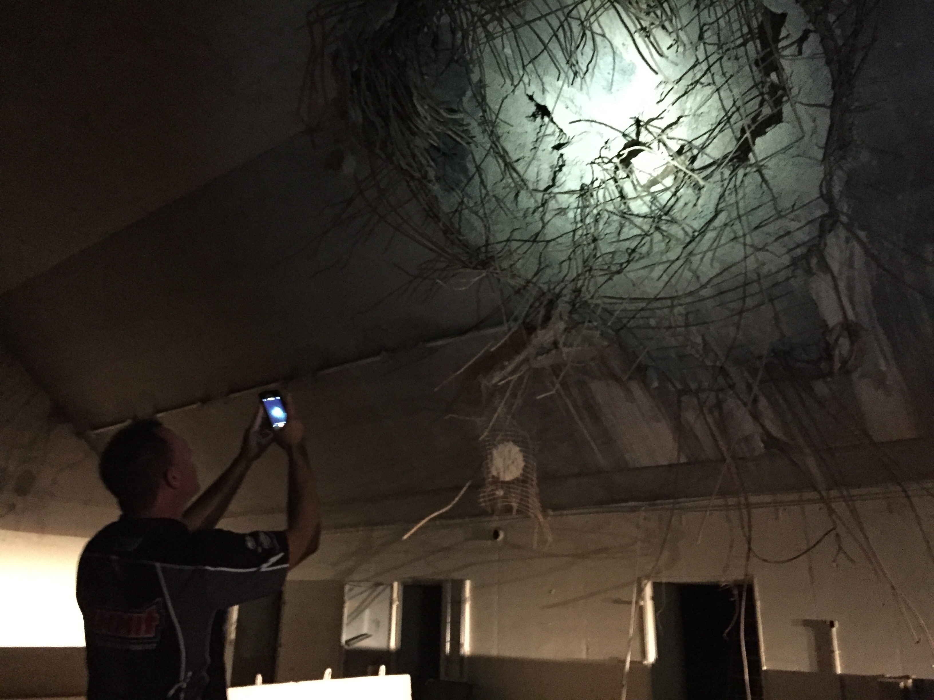 Jason Line surveys damage from the inside to one of the blown-up bunkers at Al Jaber Air Base.