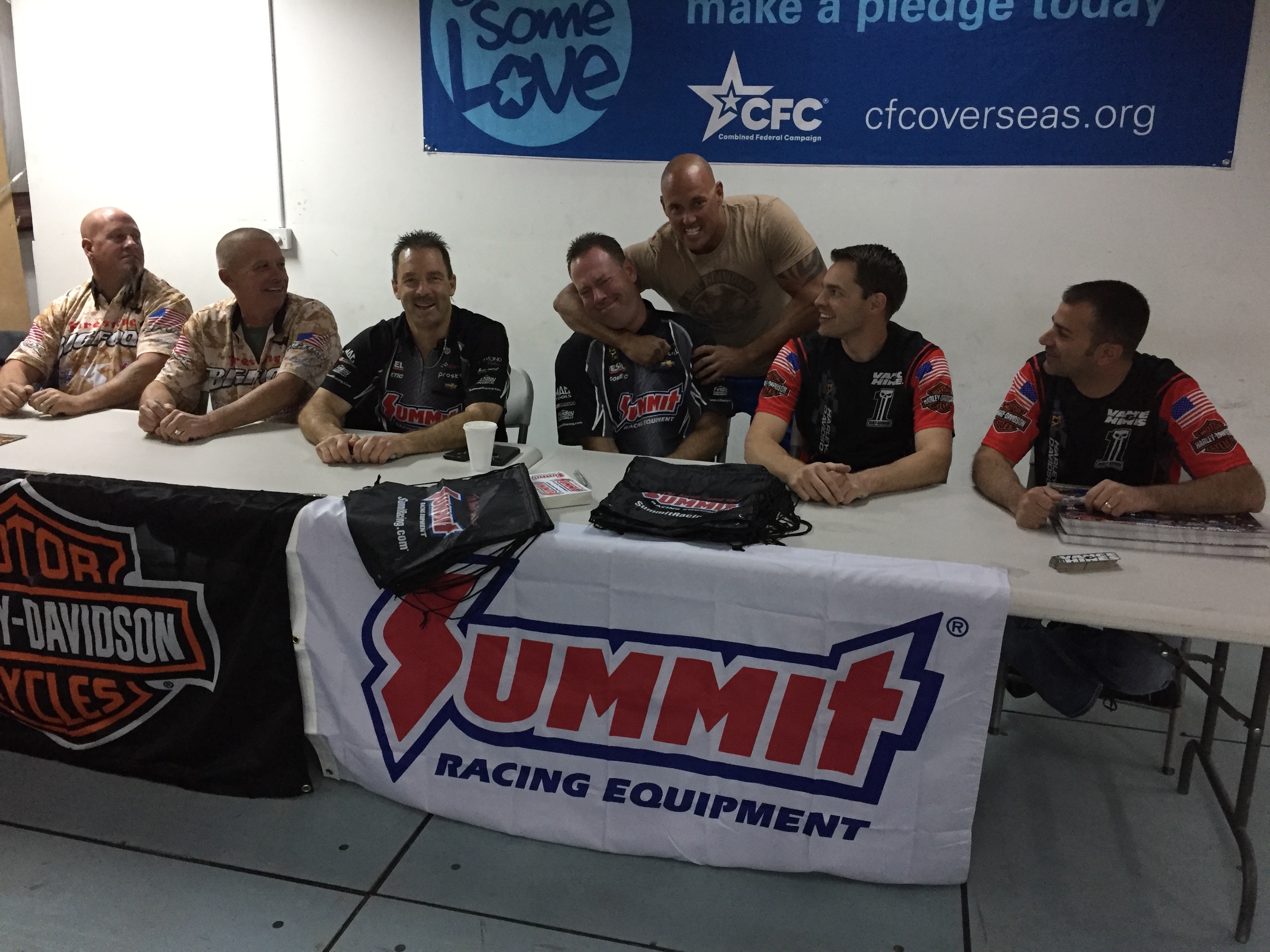 KUWAIT CITY, Kuwait – The 2016 rendition of Operation Appreciation – Summit Racing’s annual trip overseas to visit troops during the holiday season – has begun. Summit Racing Pro Stock drivers Greg Anderson and Jason Line, Harley-Davidson Screamin’ Eagle Vance & Hines Pro Stock Motorcycle riders Andrew Hines and Eddie Krawiec, and Team BIGFOOT® 4×4 Monster Truck champs Dan Runte and Larry Swim (who joined the group for the first time this year) are seizing the opportunity to say thank you to some of the men and women of our Armed Forces who are on temporary duty a long, long way from home.