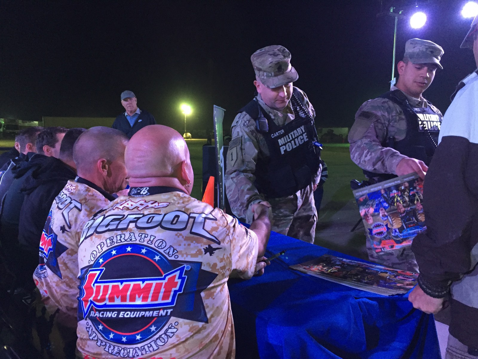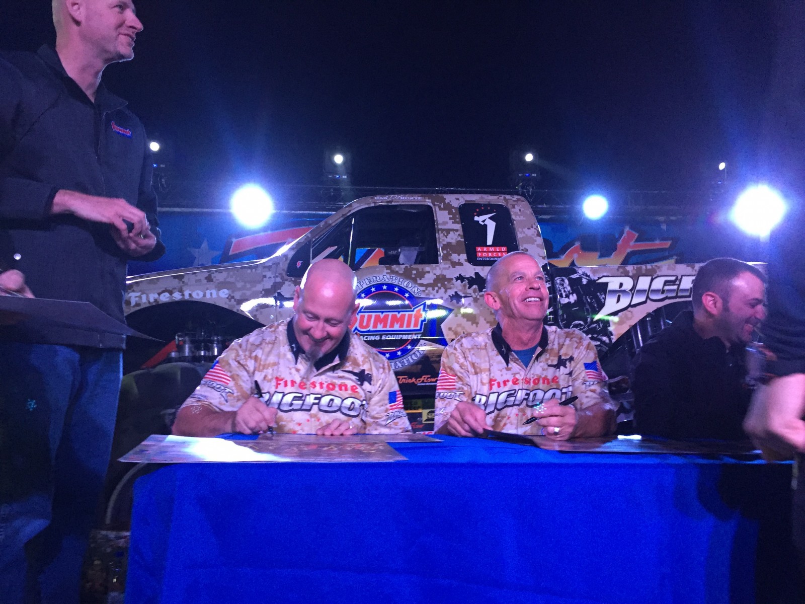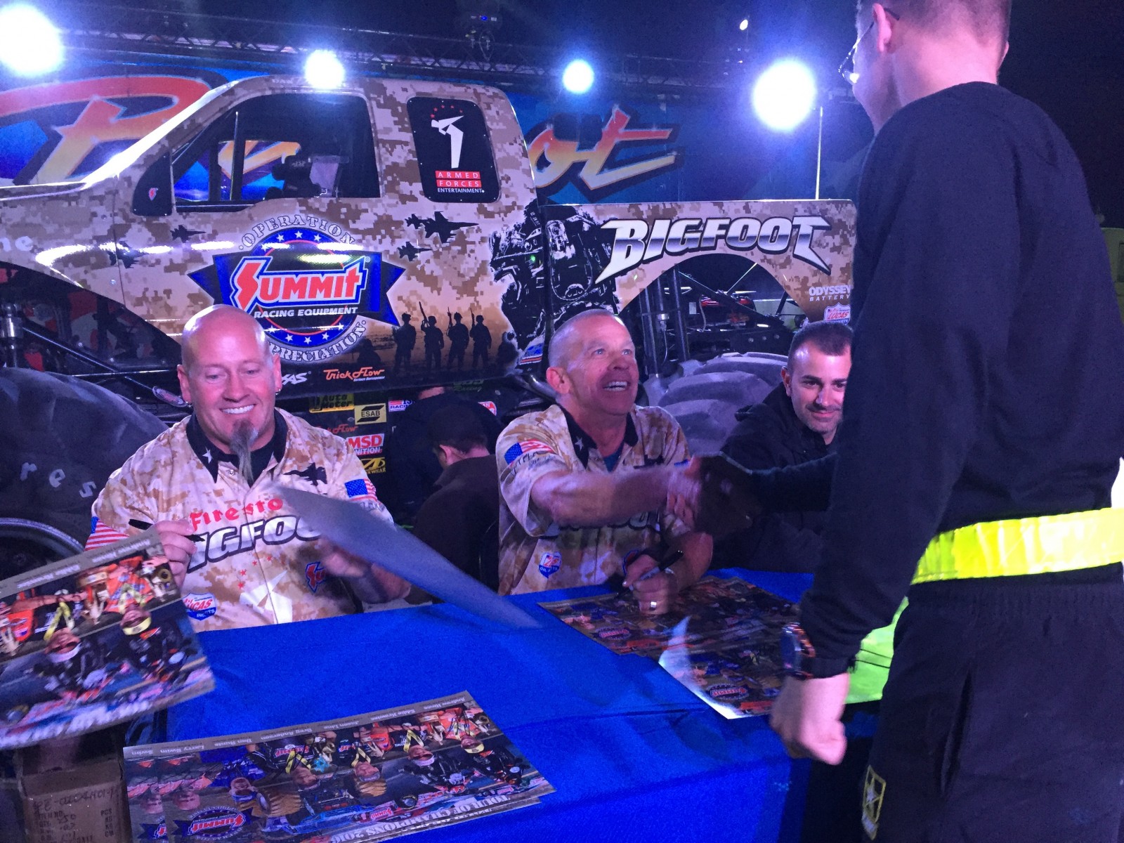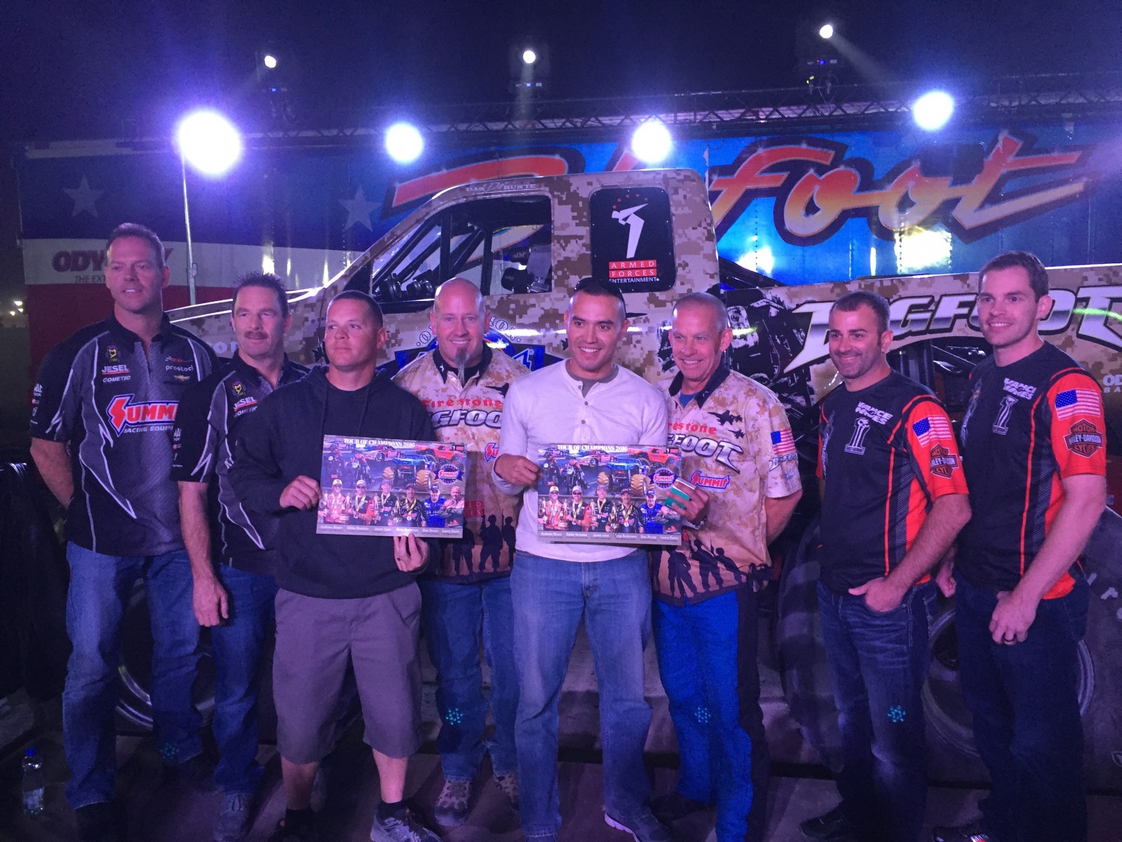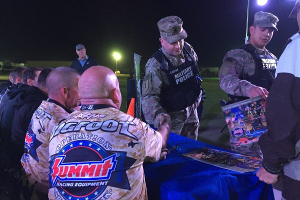 KUWAIT CITY, Kuwait – History was made on the second day of Operation Appreciation, the annual Summit Racing-sponsored trip to visit troops overseas. The diverse group of drivers – including Summit Racing NHRA Pro Stock competitors Jason Line and Greg Anderson, Vance & Hines Screamin’ Eagle Harley Davidson Pro Stock Motorcycle riders Andrew Hines and Eddie Krawiec, and Summit Racing BIGFOOT 4×4® Monster Truck drivers Dan Runte and Larry Swim – spent the day touring Camp Buehring, an installation located in the northwest region of Kuwait. They finished the evening with the first-ever BIGFOOT Monster Truck show for the men and women of our armed forces on station in Kuwait.