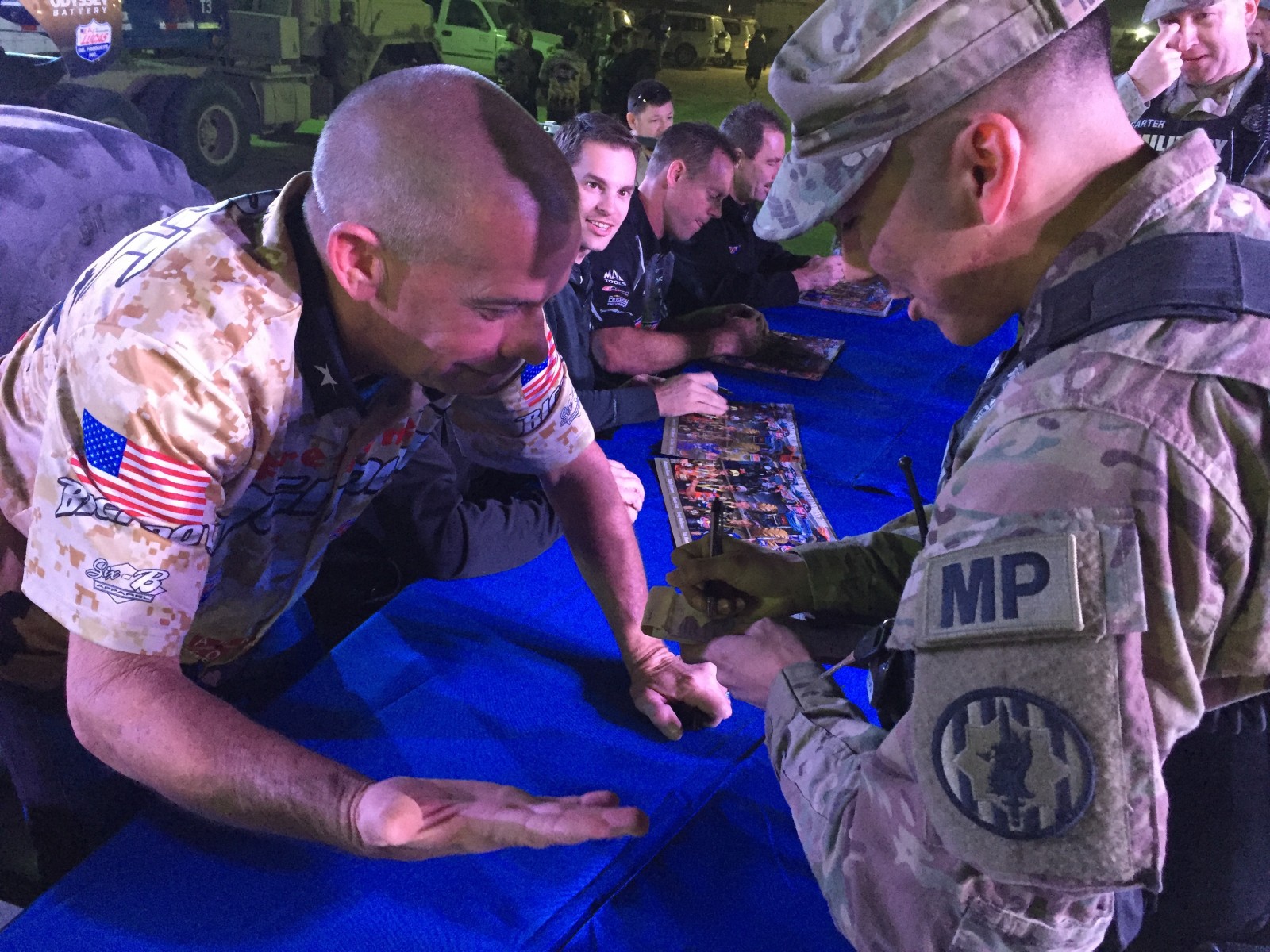 This is emotional. Very much so. It’s pretty intense, and then to get to see everyone and sign autographs and shake hands. I still have an adrenaline rush, and it’s great to be here with the group of guys we’ve got – Jason and Greg, finishing No. 1 and No. 2 in Pro Stock; Eddie and Andrew, they always run hard; I have my partner Larry with me, and our guys Bryan and A.J. This is just an awesome group, all with the same mindset as to why we’re here. We’re here for the troops. You know, we just want to bring some happiness over here for them, and I think we did that tonight.”