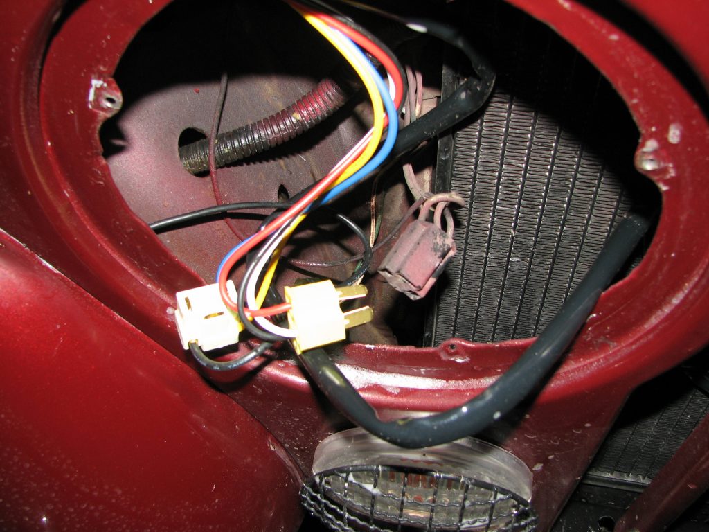 Plug the male terminal from the kit into one of the female bulb connectors from the stock wiring harness. This allows the new harness to retain the function of the headlight switch in the dash. The original harness connector for the other headlamp goes unused. Tape it up and zip-tie it safely out of the way.