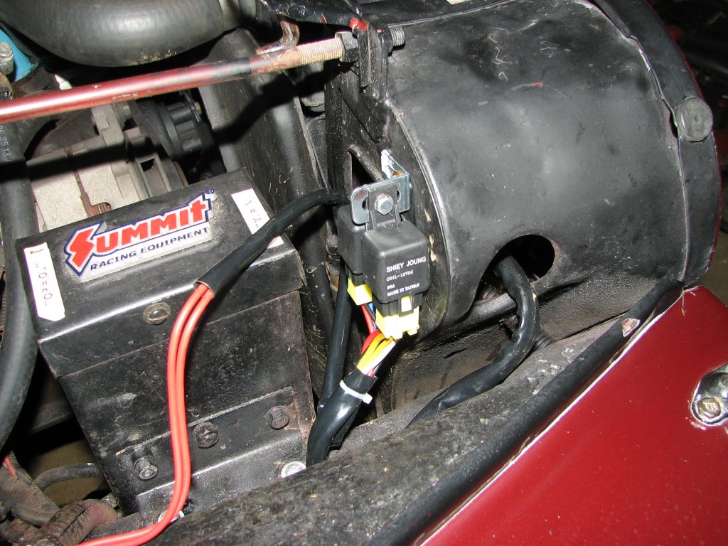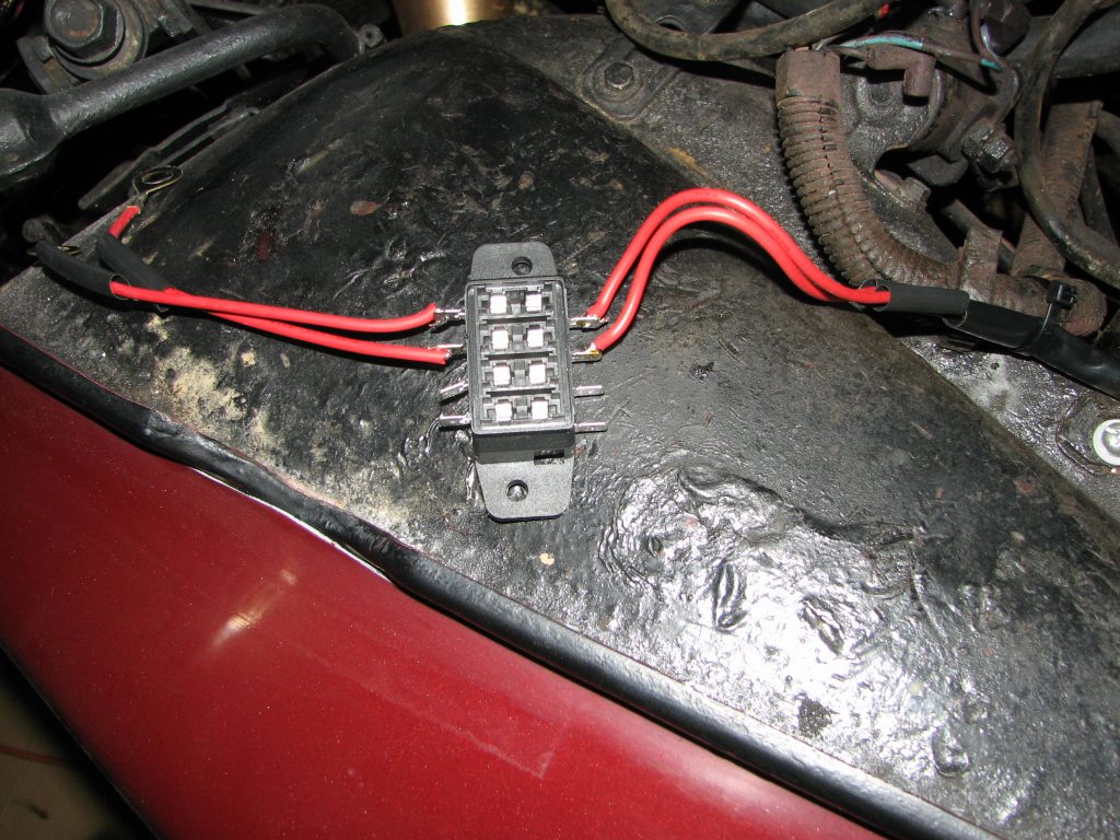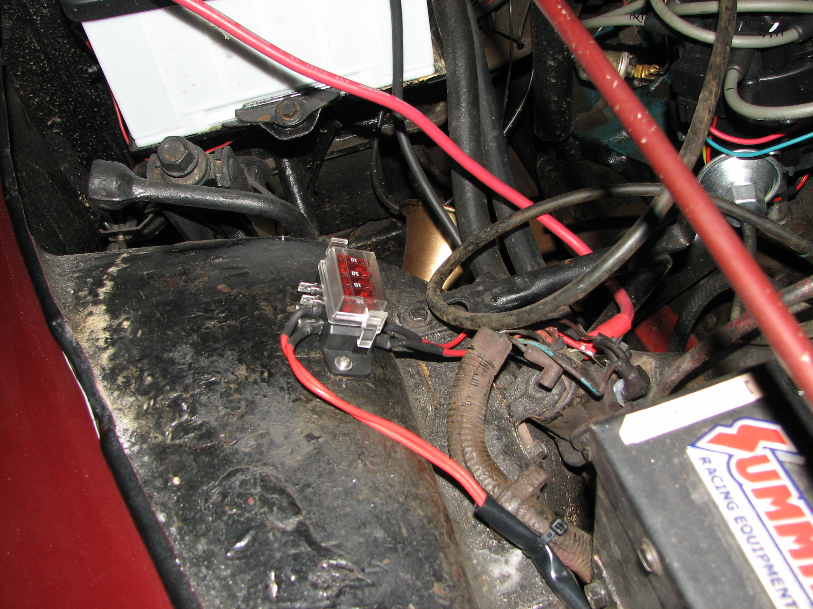 We made one very important modification to the kit by adding a pair of fuses between the battery and the relays. This prevents your wiring harness from melting to goo in case of an overload. We cut the battery feed wire and spliced-in a Summit Racing fuse block, which we then bolted to the inner fender.