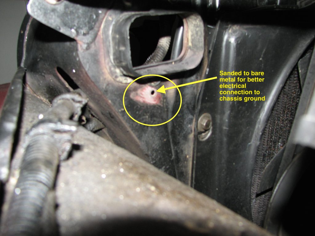 We’ll start from the headlights and work backwards. Unplug both headlights and plug the female connectors from the new kit onto the back of each 6014-style headlamp. The kit’s headlight connectors use a small ring lug that secures to the vehicle body to provide the negative ground. If your stock lights didn’t have a similar setup, you may have to drill and install a self-tapping screw to make the connection. It’s a good idea to sand/file away any surface rust and paint from the connection point on the vehicle body to ensure a solid contact with the electrical ground.