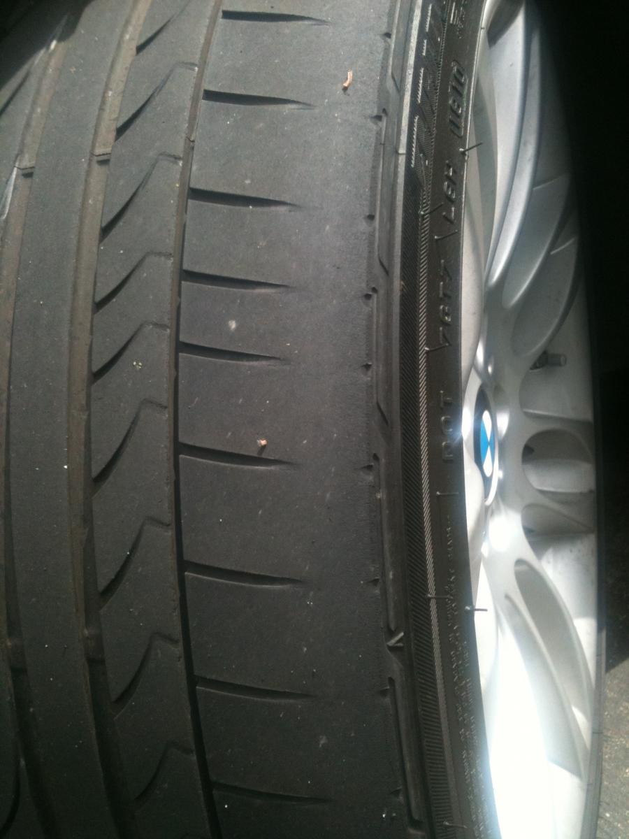 Appearance: The outside shoulder of the tire is noticeably more worn.