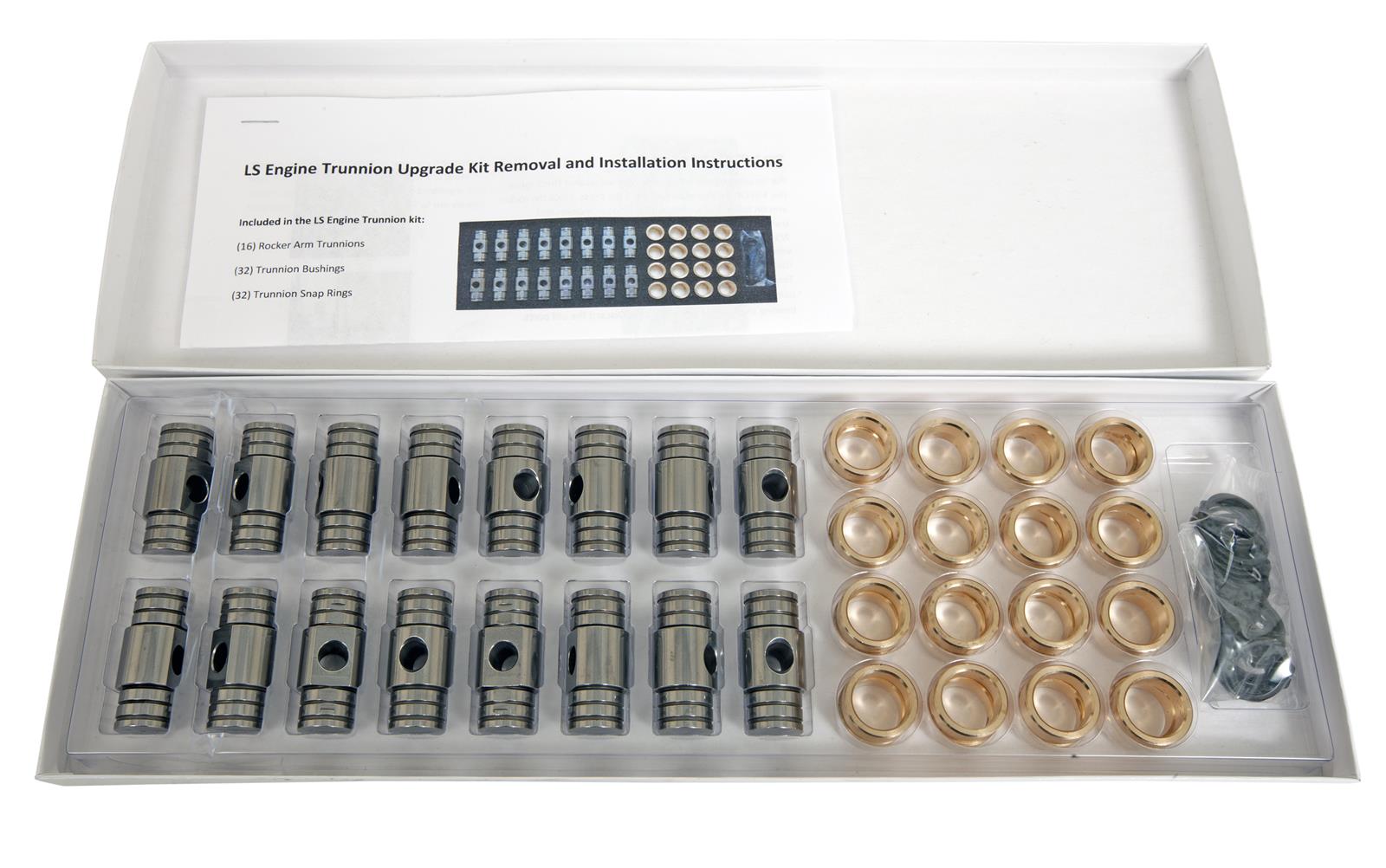 The kit includes 16 micro polished hardened steel trunnions, 32 high performance C932 bearing bronze bushings, and 32 retainer clips. It works with the following applications: