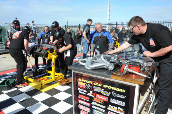 Like a Top Fuel crew preparing a dragster for its next run, competitors in the Hot Rodders of Tomorrow Engine Challenge don’t waste a single move working on their fully dressed V8s.