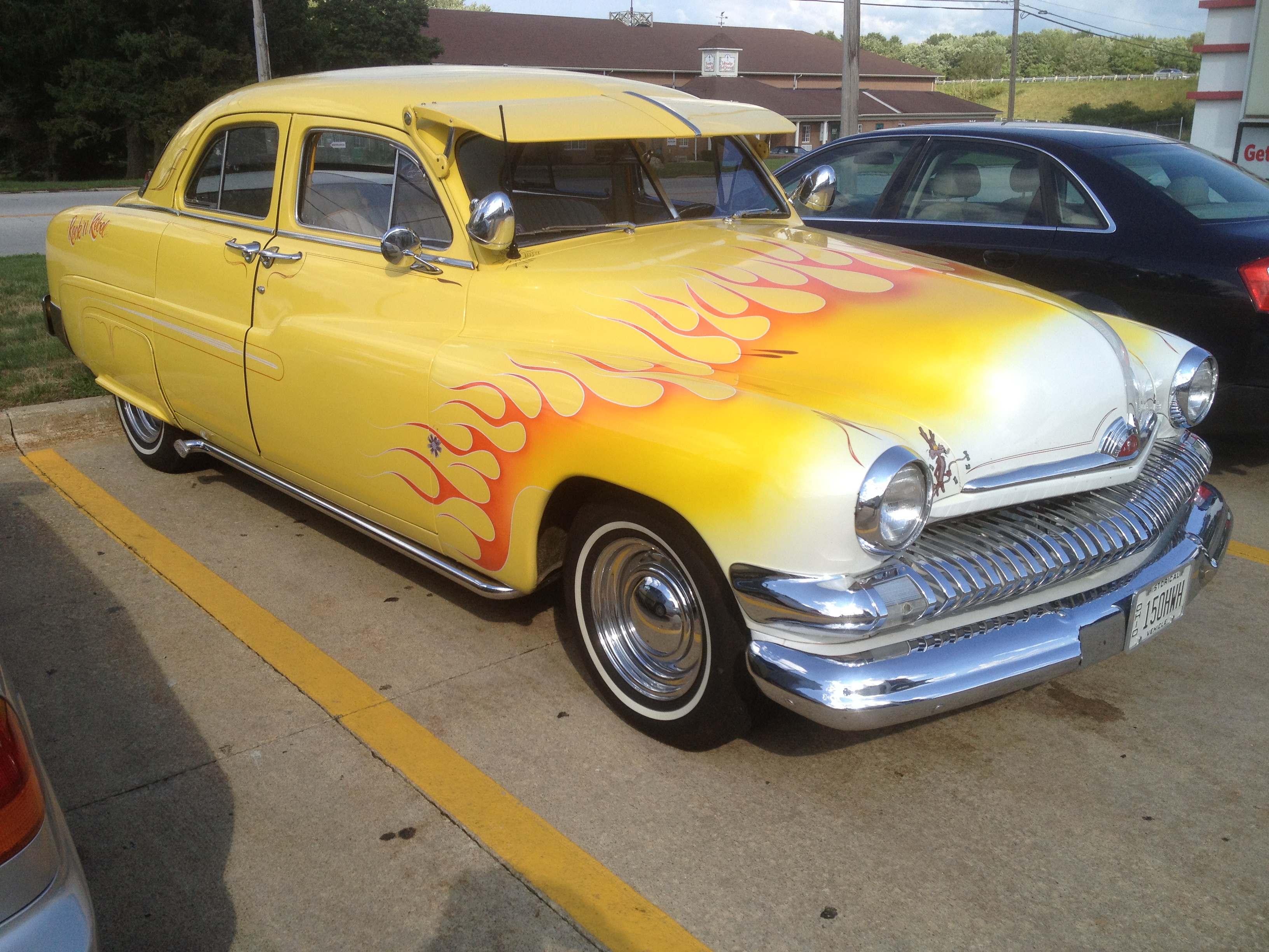 J). This term has two meanings: Either a heavily modified or repaired automobile or a 1949-51 Ford/Mercury (which is also often heavy modified).