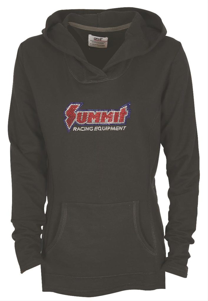 Moms love things that sparkle. Summit Racing is spelled out in rhinestones on the front of a black poly/cotton blend hoodie. Stay warm in style!