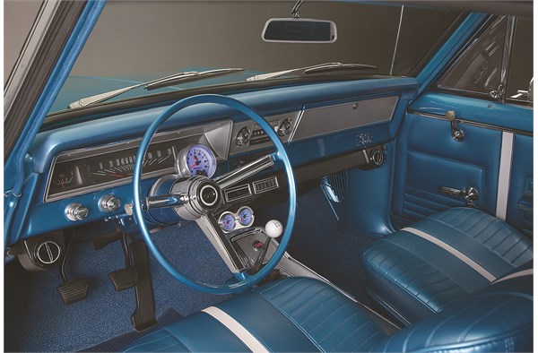Decidedly less cutting-edge is the Nova’s interior, which Wilkins elected to keep true to the original. Enlisting the help of Wicked Whips Customs in Brookville, OH the seats were covered with reproduction bright blue vinyl, and the original blue carpet was replaced, as well. Hinting at the car’s high performance underpinnings, you’ll also find a trio of Auto Meter C2 gauges, plus a Hurst short-throw shifter mated to the Nova’s TKO600 5-speed tranny.