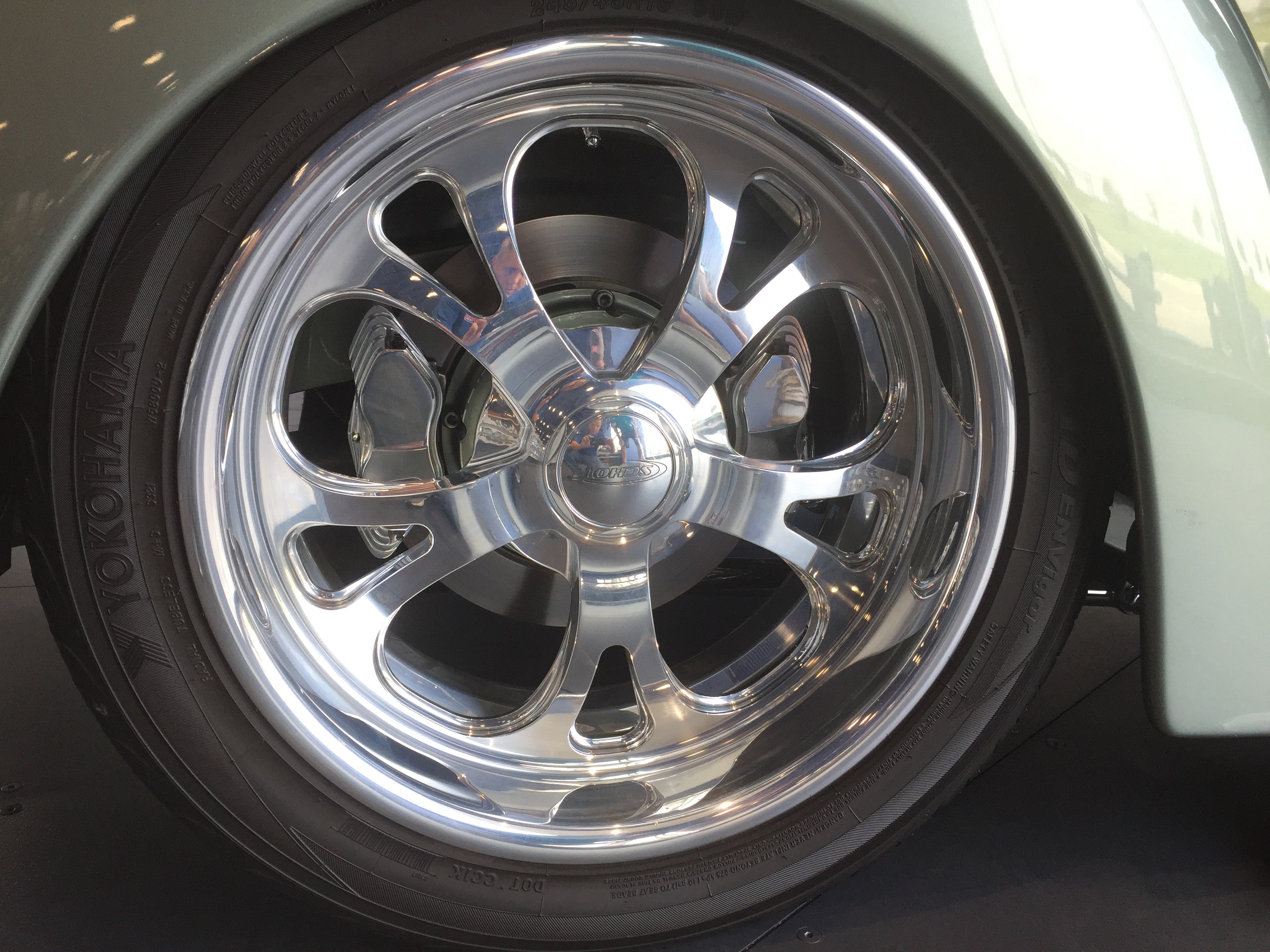 The body sits atop a fully custom and braced Chubby Chassis with triangulated four-bar rear chassis with Aldan American coil-overs front and rear. Wilwood polished brakes provide the stopping power with a unique dual-caliper setup on the rear brakes.