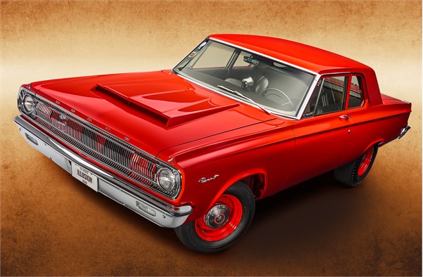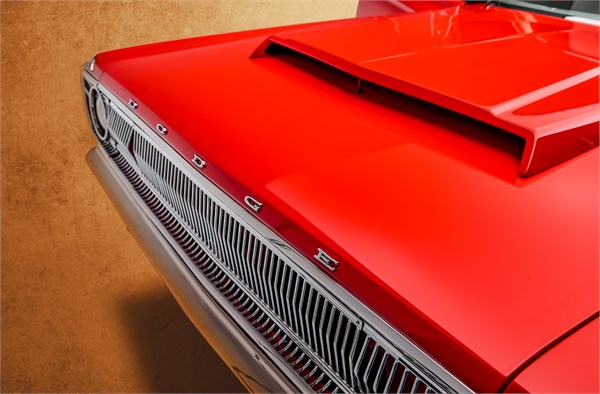 Built with an Indy aluminum block and Mopar Performance heads, the 426 wears a Hemi-orange paint job, two Holley four-barrels, and all of the period-correct equipment, except for one “second day” modification.