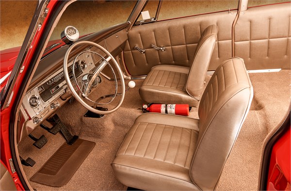 Inside, the fawn interior looks showroom-fresh and period-correct, with only a few mods visible to the sharp-eyed Mopar fanatic.