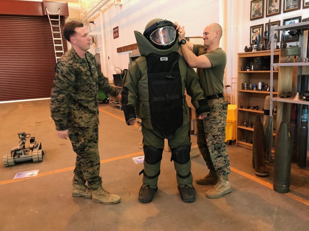 The interesting thing about the bomb suit is that before you can even be accepted into EOD, you have to put on this 110-pound suit and pick up an 80-pound bomb shell and walk around with it. Once you put the suit on, you can barely move. Your arms stick straight out like Ralphie in “A Christmas Story,” and it’s so hot. I was only in there a few minutes and was already getting hot. They say that after you have this thing on so long, some guys lose their train of thought. They call it ‘bomb suit stupid.’ I can see where that would happen. Hat’s off to those guys for doing what they do, going out there to disarm a bomb and knowing it could kill you, and having to be on top of your game while wearing this suit. It was an experience, and I’m glad they offered to let me try it on.