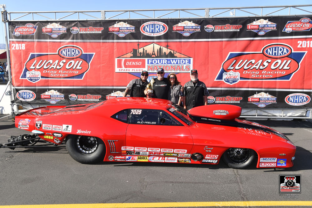 The red Top Sportsman ’69 Camaro with black racing stripes found its way to the winner’s circle when Bud Preuss recorded the second perfect .000 light in eliminations next to a red-lighting Jeff Gillette and picked up his first national event trophy. Gillette was .005-second too quick in his foul start, allowing Preuss to mosey down the quarter-mile to a winning 7.490 on his 6.94 dial.