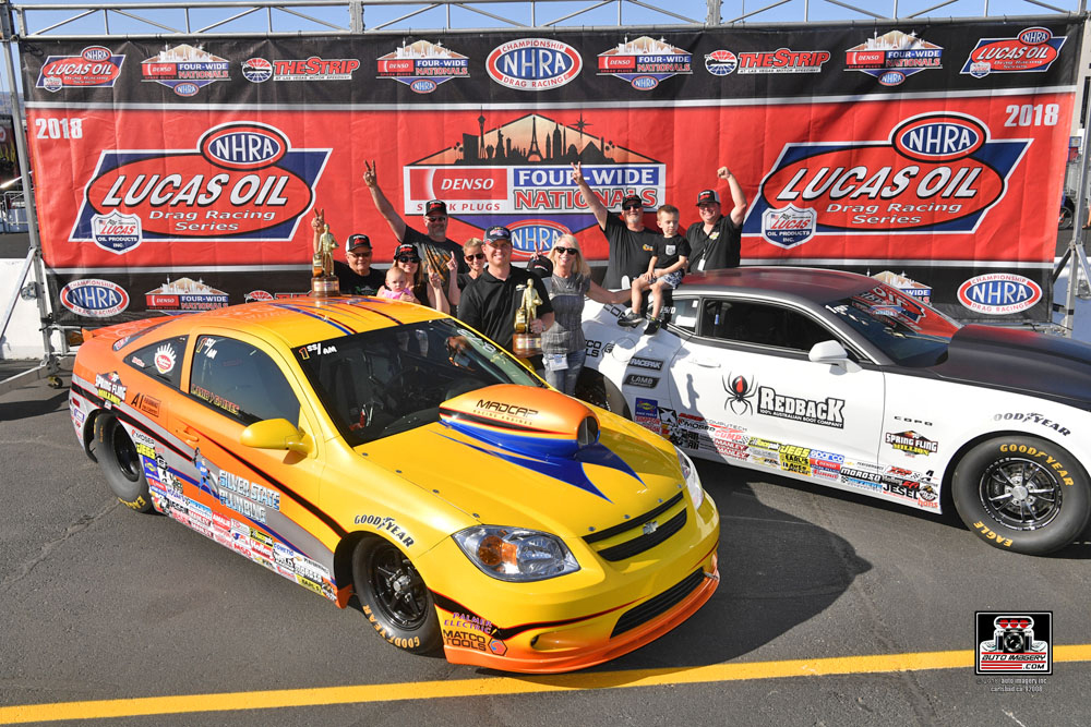 The reigning Stock and Super Stock Lucas Oil Drag Racing Series world champion sent a big reminder to the competition as he took the double-up win in Las Vegas. Hometown hero Lamb, of Henderson, NV, drove his FS/D 2017 Chevrolet Camaro to victory over E/SA ’69 Dart campaigner Larry Gilley in Stock Eliminator with a .034-second reaction time and 10.025 at 130.51 mph on his 10.01 dial to a .039 reaction and 11.043 (11.03), 117.84. In Super Stock, Brad Burton’s .002-second red light sent Lamb directly ahead to victory in his SS/AM 2010 Cobalt.