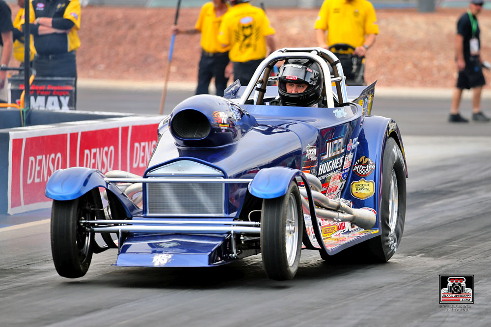 In his 19th final round appearance, Michael Miller claimed his ninth NHRA Wally trophy and his fourth Las Vegas win. The driver of the eye-catching Super Gas ’27 Ford roadster survived a double-breakout with Aaron Kinard, who was .000 on the tree to his own .012-second reaction time. The Santa Fe, NM resident clocked a 10.037 at 145.28 on the 10.05 index to a 10.029, 163.18.