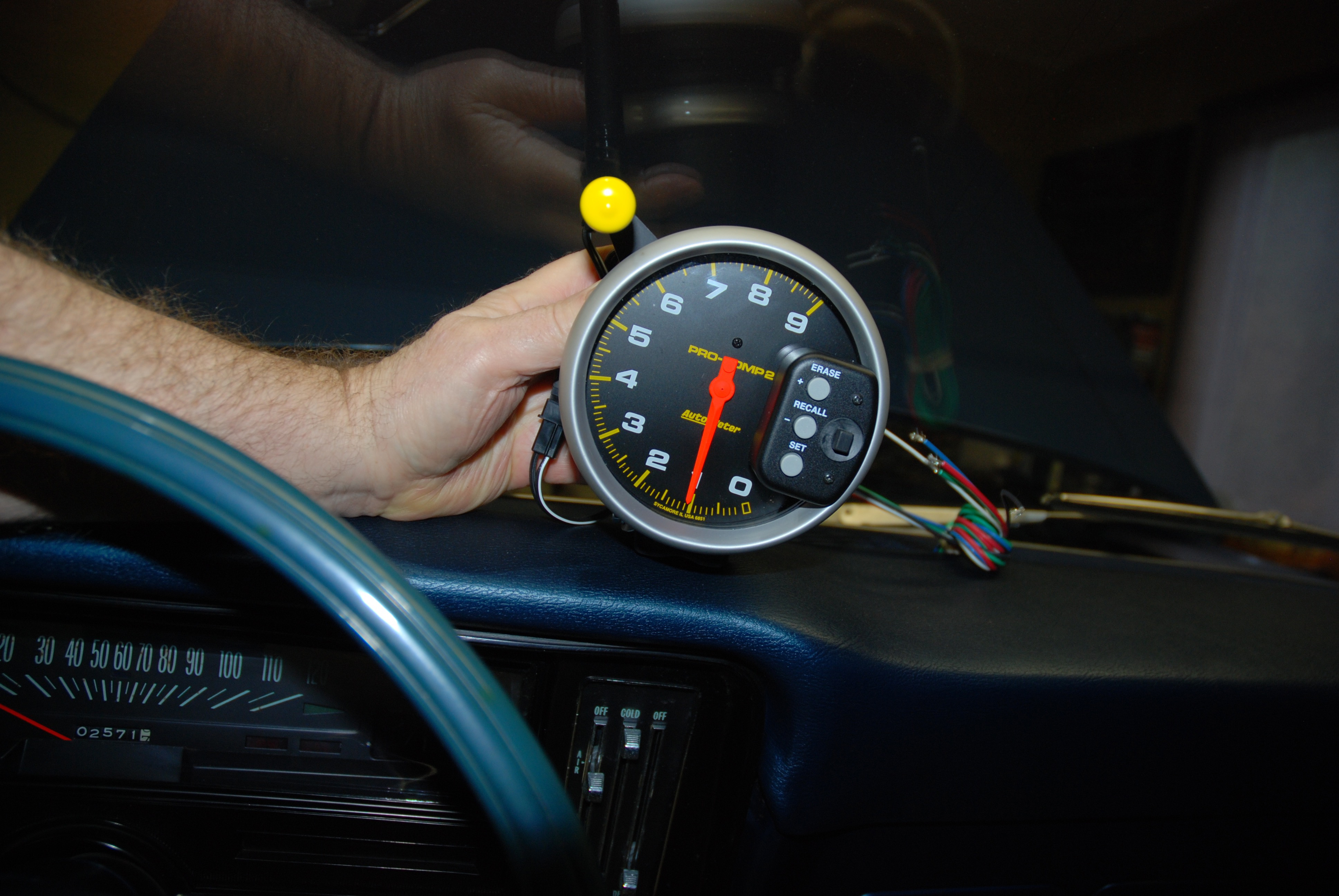 When mounting the tach, it’s a good idea to try it in various mounting locations in the car. Here, we’ve tried the tach right on the dash and also on the steering column. (Image/Wayne Scraba)