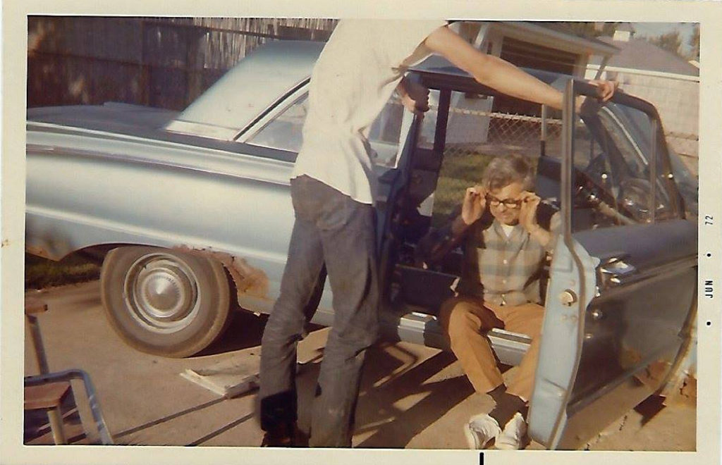 “This pic was taken back in 1972, dad has passed-on now. We were patching the floor. It was my Grandmother’s car that I bought for $50.”
