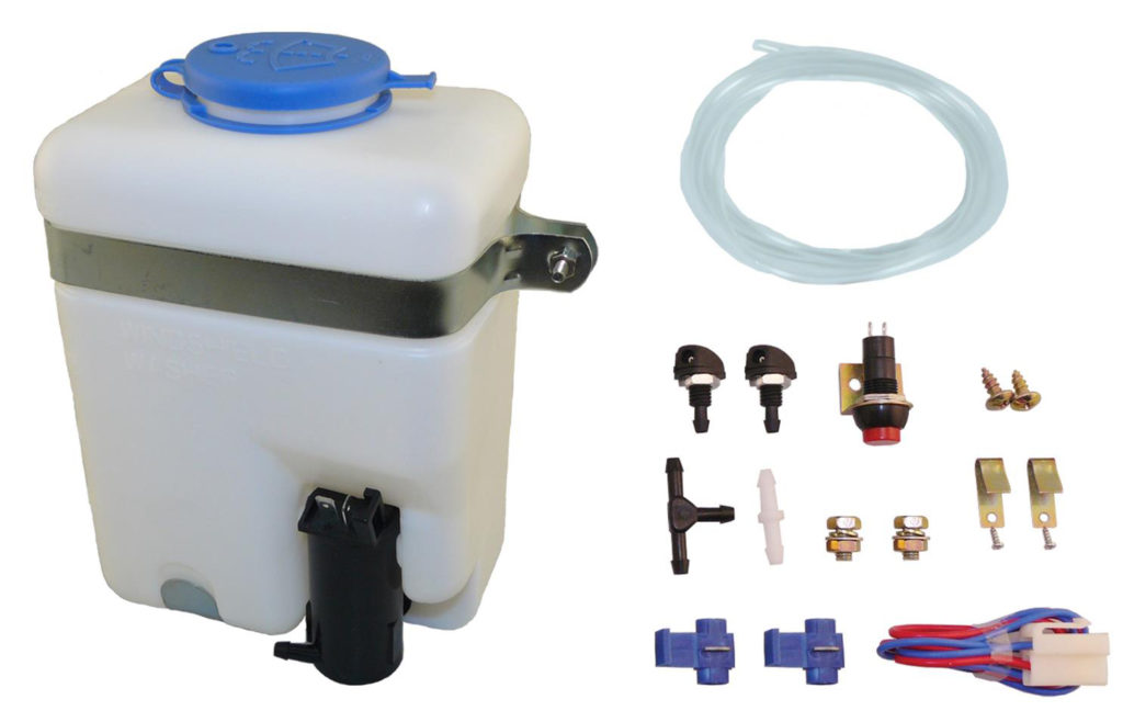 The kit comes with pretty much all you’ll need to install a new windshield washer system in your ride, including a reservoir with electric pump, the hood-mounted squirters, and a cabin on/off switch, plus the appropriate hoses, wiring, and clamps.