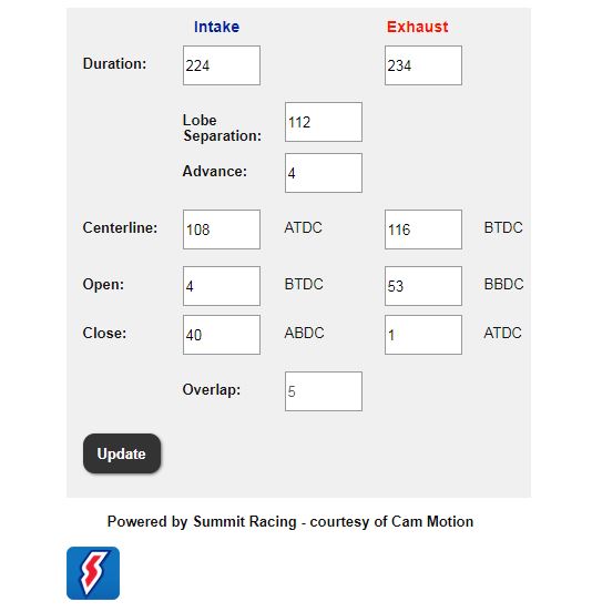 The Summit Racing Cam Timing Calculator does two things: