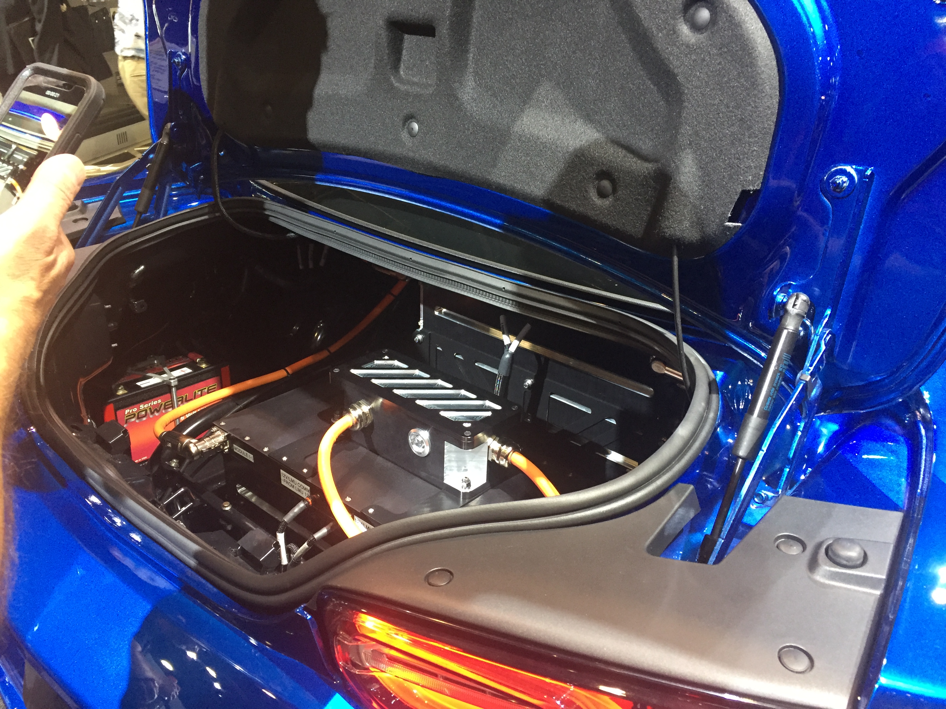 The battery pack is composed of four 200-volt modules, each weighing approximately 175 pounds, mounted strategically in the car for optimal weight distribution. Two are located in the rear seat area and the other two are in the trunk: one in the spare tire well and the other in the area over the rear axle.