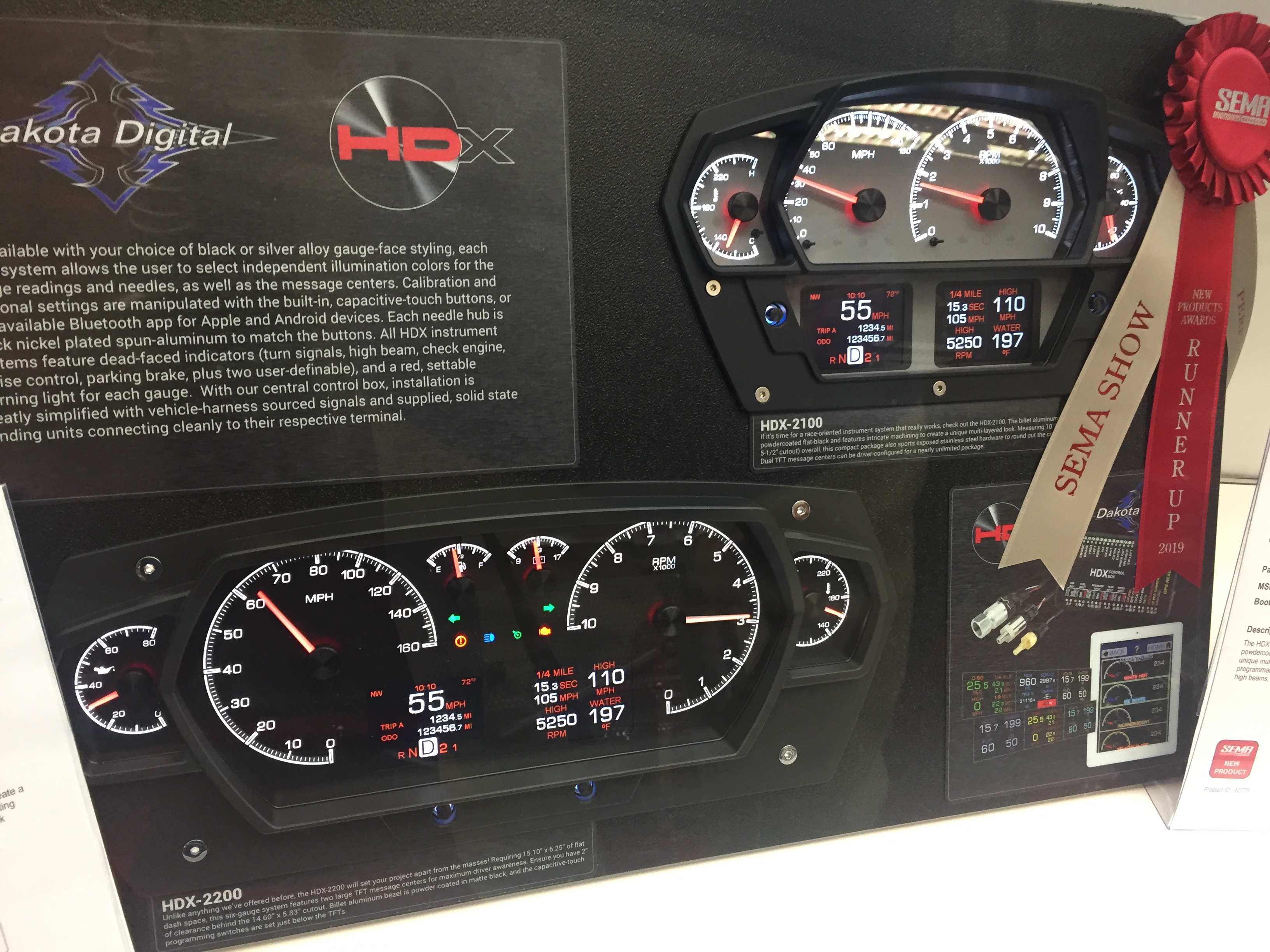 The Dakota Digital HDX-2100 is a race-oriented instrument system that features a powdercoated billet aluminum face plating and your choice of black or silver faces. It offer 30 programmable lighting colors to match any theme, plus indicators for blinkers, high beams, check engine, cruise control, and more.