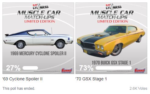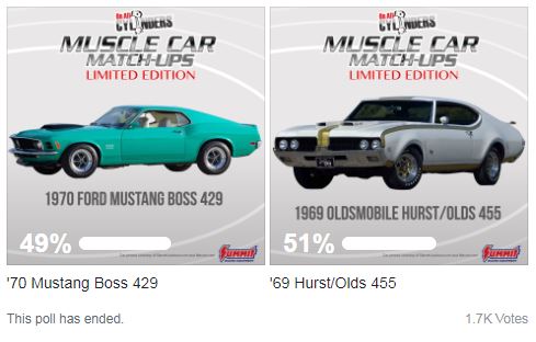 Our very first match-up was the hairiest one yet. The 1970 Boss 429 against the 1969 Hurst/Olds 455. As you can see here, the Hurst/Olds actually beat the Boss in Facebook voting. But voting is ALSO taking place on Instagram, and this was the sole instance in Round 1 where the Instagram vote was able to sway the results opposite of the Facebook tally.