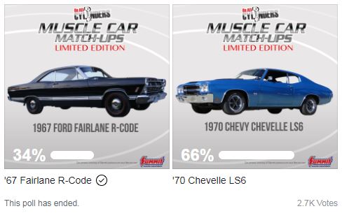 To be fair, the ’70 Chevelle is sort of the quintessential muscle car of the era. So its 2-to-1 win on Facebook, and nearly 4-to-1 drubbing on Instagram (1,879 to 488) can’t be described as shocking.