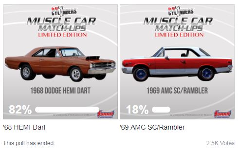 To say the Hemi-powered Mopars were dominant in Round 1 would be an understatement. The AMC may be getting Rodney Dangerfield-ed a bit here, but you won’t find any OnAllCylinders staffers debating the merits of the Hemi Dart. That’s what happens when you run 10s from the factory with very few mods in 1968.