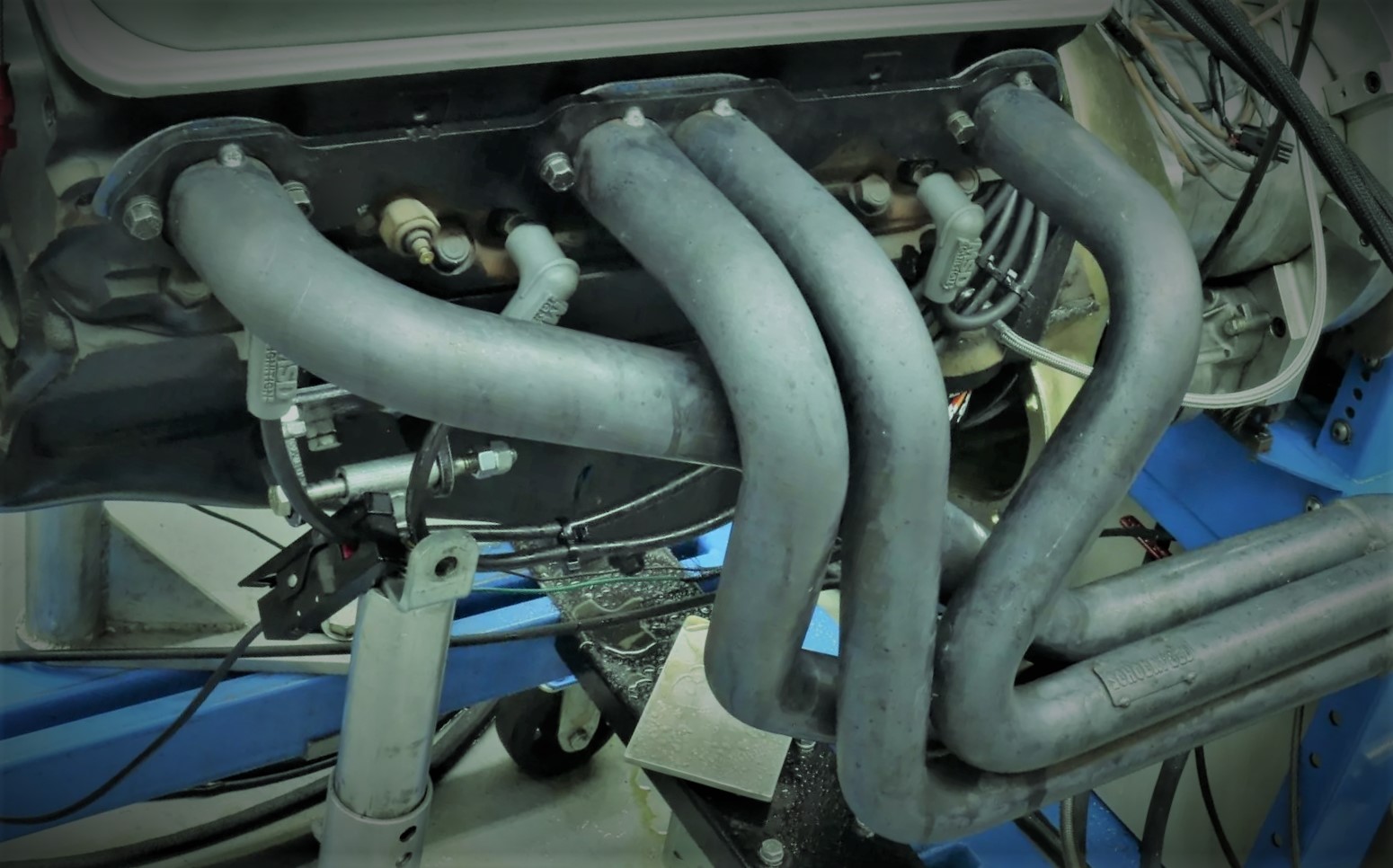close up of headers on a chevy 305 small block v8