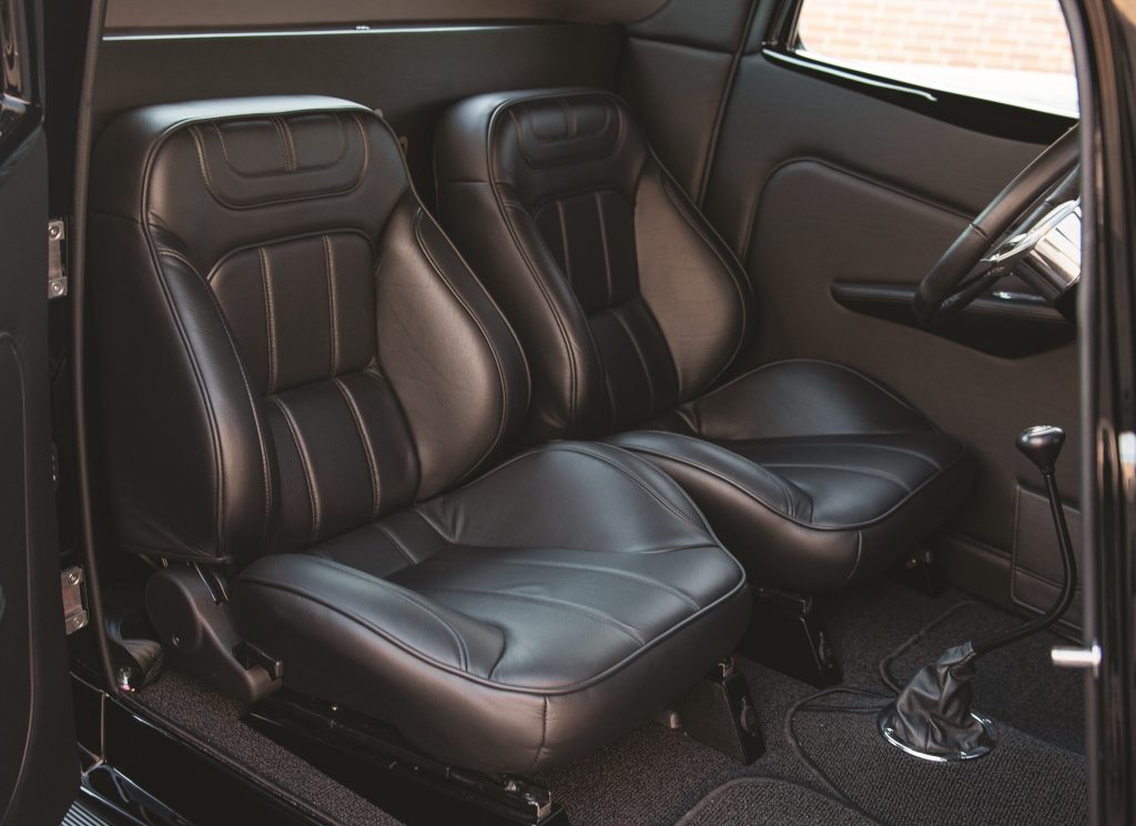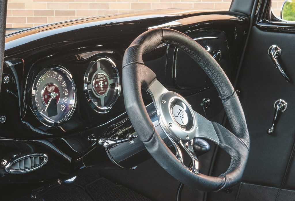The 25th anniversary car was built by Precision Hot Rods and Fabrication in Macedonia, Ohio. It sports a 1933 Ford grille with 1934 doors, causing some debate among the street rodding crowd. Dixey calls it a 1934 and likes how it pays homage to the original Street Rodder Road Tour Ford without duplicating it. While the original features a Chevy engine, the 25th anniversary edition has a Ford powerplant. The original is blue, but the new ’34 is beautiful black with silver stripes to mark the tour’s silver anniverasary.