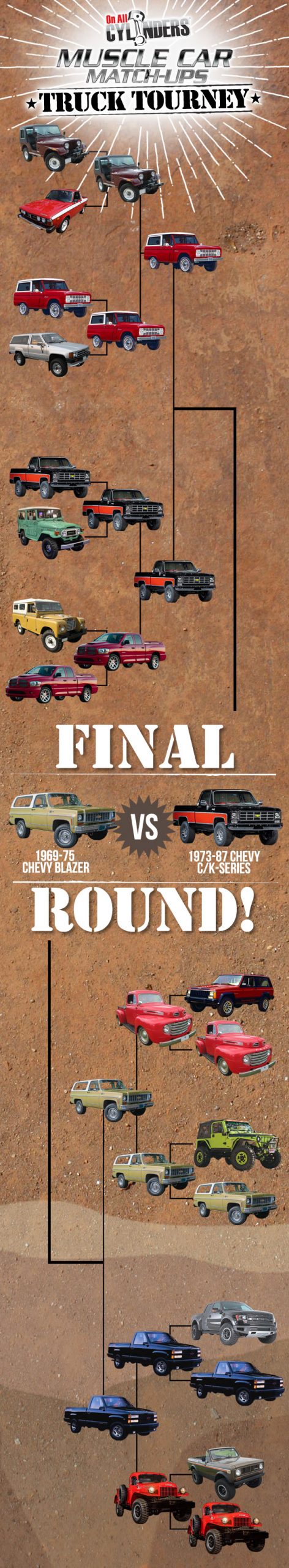 This is it. The final round pairing in our annual Muscle Car Match-Up competition. This year, we focused entirely on trucks and SUVs, cramming the 16-vehicle field with classic haulers, tire-nuking boulevard bashers, and go-anywhere off-roaders.