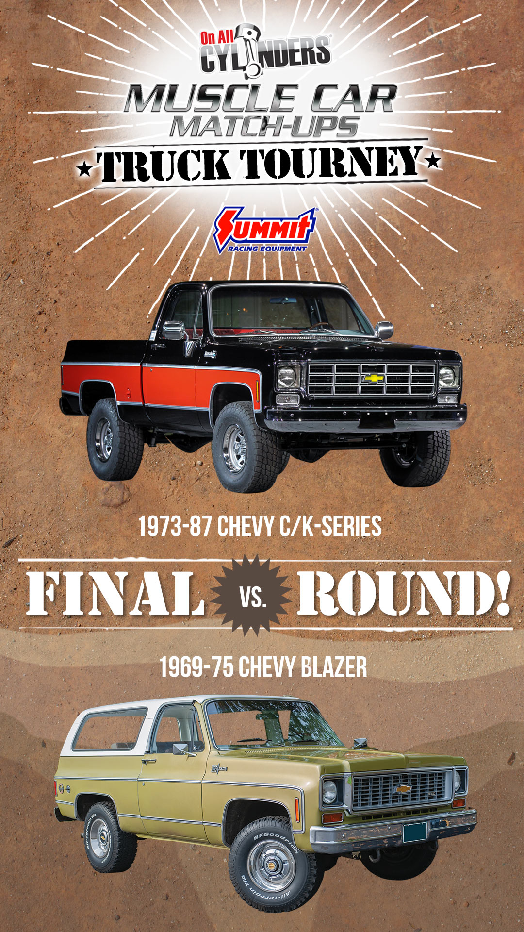 - Vote when you see the polls open for each Match-Up at the Summit Racing Facebook page