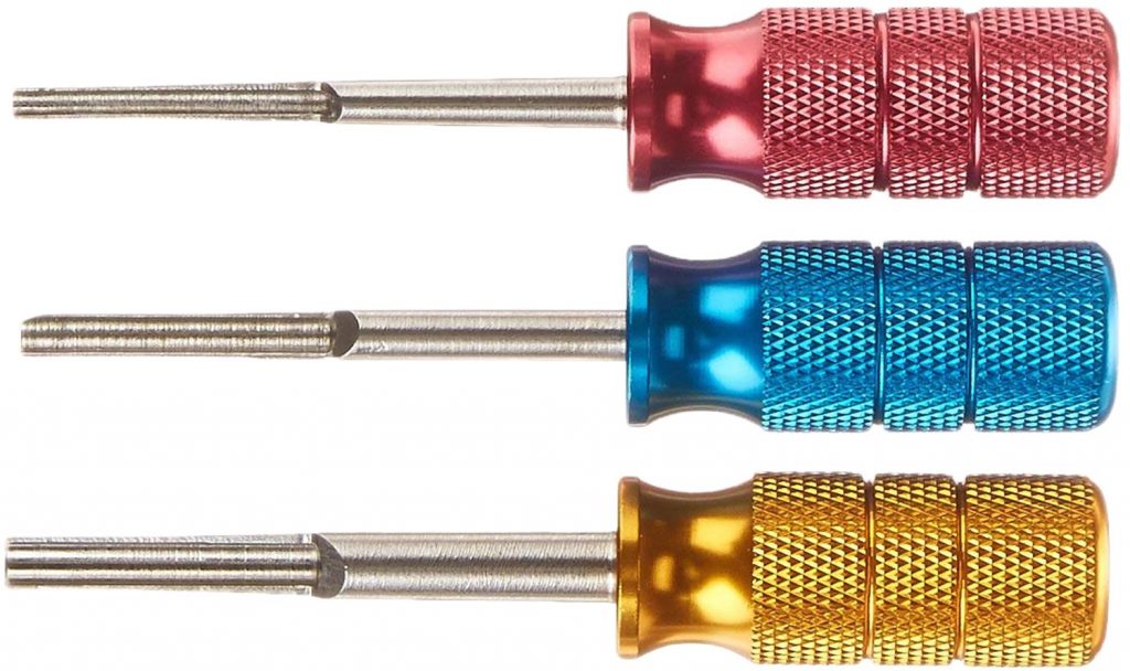 A similar set of Deutsch Terminal Release Tools is manufactured by S&G Tools. Here, there are three different tools: one for 14-16 gauge connectors, another for 16-18 gauge connectors, and one for 20-24 gauge connectors. The handles are anodized aluminum while the shafts are stainless steel. This tool set works the same as the Lisle tool explained above.