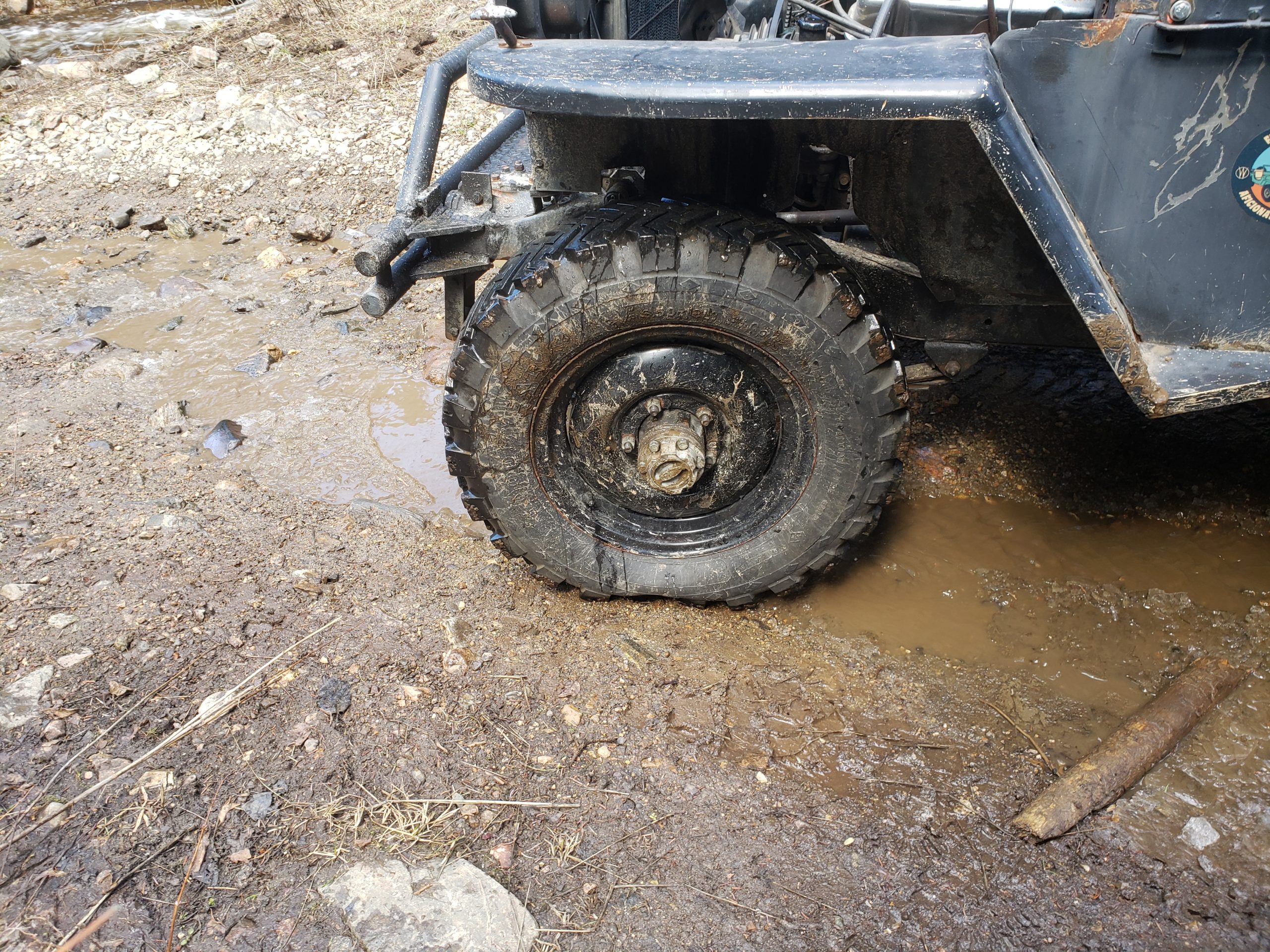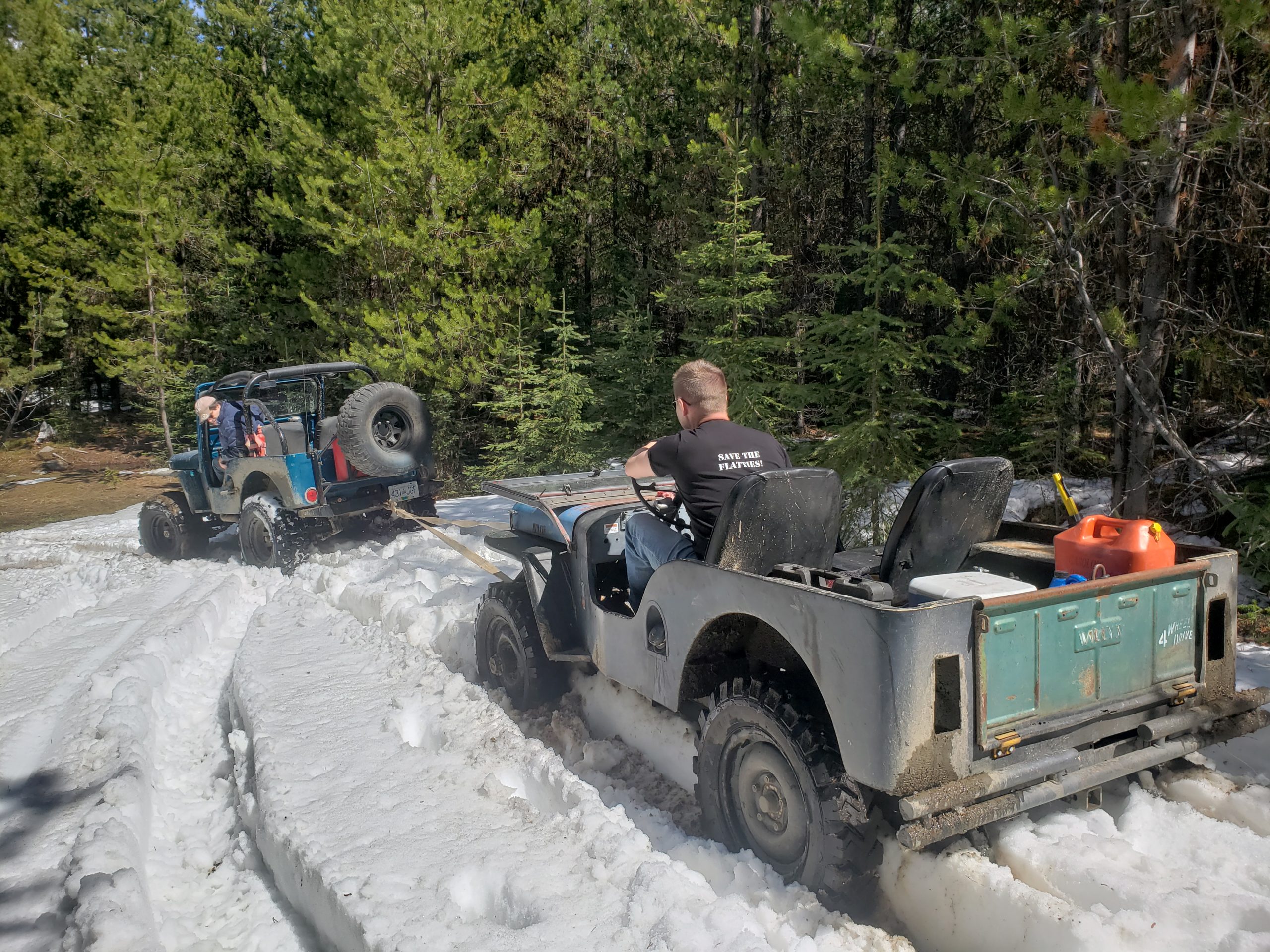 Justin’s 1947 CJ2A has an odd-fire Buick V6 swapped in many moons (and probably owners) ago, replacing the factory “Go-Devil” flathead 4 banger. The T-90 three-speed transmission and Dana 18 transfer case are the stuff of legend and could likely run filled with gravy. Open axles and reproduction Goodyear military tires got Justin in trouble a few times during the day, but since the CJ weighs just a whisker over 2,000 pounds, getting him unstuck was not an issue. (Image/Bryan Irons)A view from behind the wheel. Rusty fuel, a cranky carburetor, a throttle petal that didn’t want to stay in place, and a few high centering moments in the snow didn’t deter Justin from having fun. Note the holes where the factory gauges used to live. Justin does have an oil pressure and water temperature gauge—what else do you need on the trail? (Image/Bryan Irons)John’s 1951 M38 has a fuel injected GM 4.3L V6 attached to a T19 four-speed and a Dana 300 transfer case out of a Scout. Super Swamper TSLs are mounted on a set of 15 x 8 “wagon wheel” rims. Inside the axles are a set of Lock-Rite lockers and 5.38:1 gears. An old Rancho lift kit adds about 2.5 inches of elevation. The combination transformed the lightweight jeep into a mountain goat. (Image/Bryan Irons)Yeah, we brought a bazooka to a game of Clue. Our AMC 401-powered CJ-7 gladly broke trail when we found snow still on the ground and easily walked though the rest of the terrain we came across. The 401 is backed by a T19 four- speed and a Black-Box-I reduction box with a Dana 300 hanging off the back. The Dana 44 rear axle has 4.10 gears and an ARB air locker, and the Dana 44 front axle has a Yukon Gear Zip Locker and a Dana 50 gear set. Both have Yukon 35-spline chromoly axles, and the front 44 has Yukon Super Joints and manual locking hubs. Ground clearance is provided by a Rubicon Express Extreme Duty 4.5 inch lift kit and a 1.5 inch Daystar body lift. The 37×13.5-17 Pitbull Rocker bias ply tires and beadlock wheels have been tearing up the trail for almost a decade. (Image/Bryan Irons)You should begin any off-road trip should by lowering your tire pressure. This helps improve traction and will help save your back when riding around in old Jeeps with stiff suspensions and big tires. (Image/Bryan Irons)Rushing water, ice, snow, and a sputtering carburetor can make for interesting times, but Justin made it across after only a few tries. (Image/Bryan Irons)Apparently, the ruts we dug in the snow are the reason Justin got stuck. No worries—we broke out the tow straps and played “drag the flatty down the trail.” It’s all part of the fun! (Image/Bryan Irons)