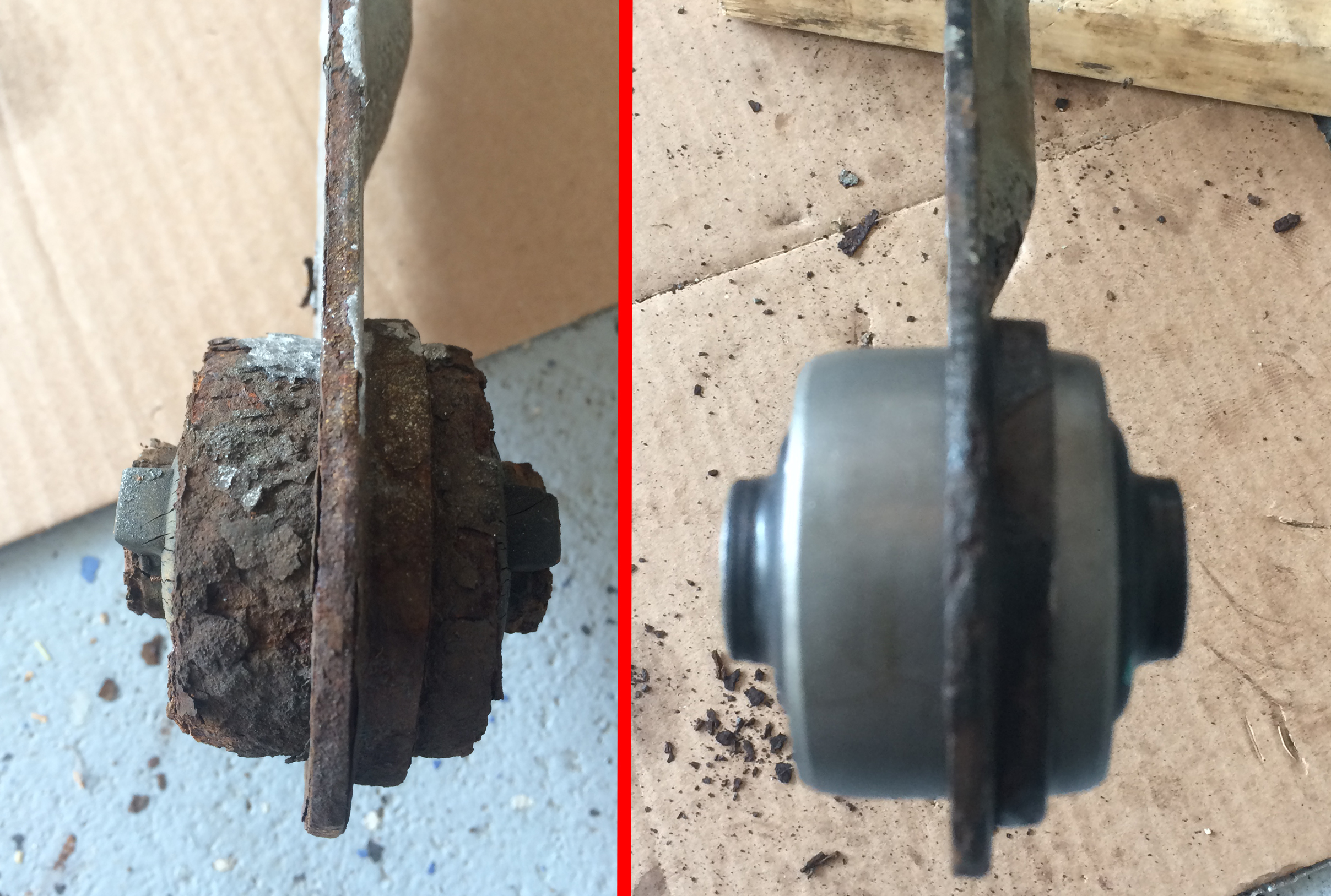 A ball joint press can push-out crusty, frozen bushings like this one from the rear suspension trailing arm of a Nissan Sentra. And it helped us install the new ones too—though it required an impact gun instead of a hand-cranked wrench for a little more oomph. (Image/OnAllCylinders – Paul Sakalas)