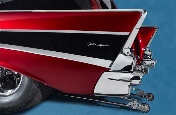 Sharp-eyed readers may have noticed a design theme. The door pillars, the exhaust cutouts, and the accents on the front fenders are all canted forward at the same angle, and that angle is 32 degrees. “With the three 2-barrel carbs on the engine, I just had this idea to carry that ‘3-2’ theme across the whole car,” Gene says.