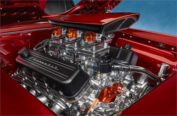 - Air and Fuel: Holley Pro Dominator tunnel ram intake, three 2-barrel Holley 2300 carburetors, custom scoop, fuel lines, and tank