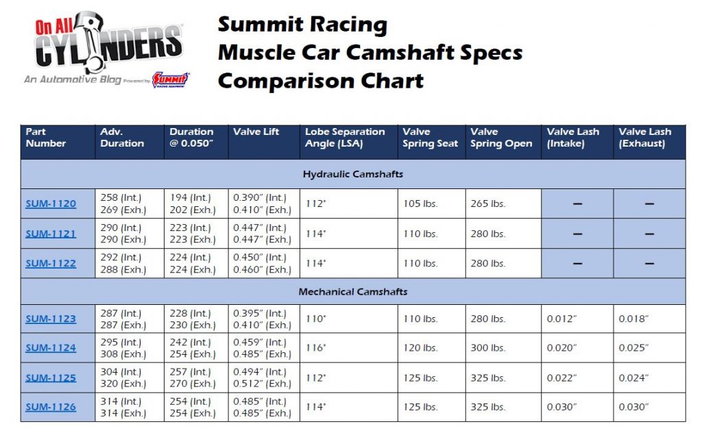 Summit Racing Small Block Muscle Car Camshaft Part Numbers, Specs & Comparison Chart