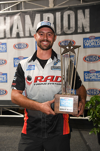 In earning the award, he edged out a list of very talented first-year competitors in the NHRA Camping World Racing Series that included Josh Hart, Chad Green, and Krista Baldwin, to name a few. The recognition was well-earned considering his victories during the four-wide event at zMAX Dragway in Charlotte, another win in Las Vegas, and a win in Topeka, where he became just the sixth driver in Pro Stock history to post a perfect .000 reaction time in the final round of a race.