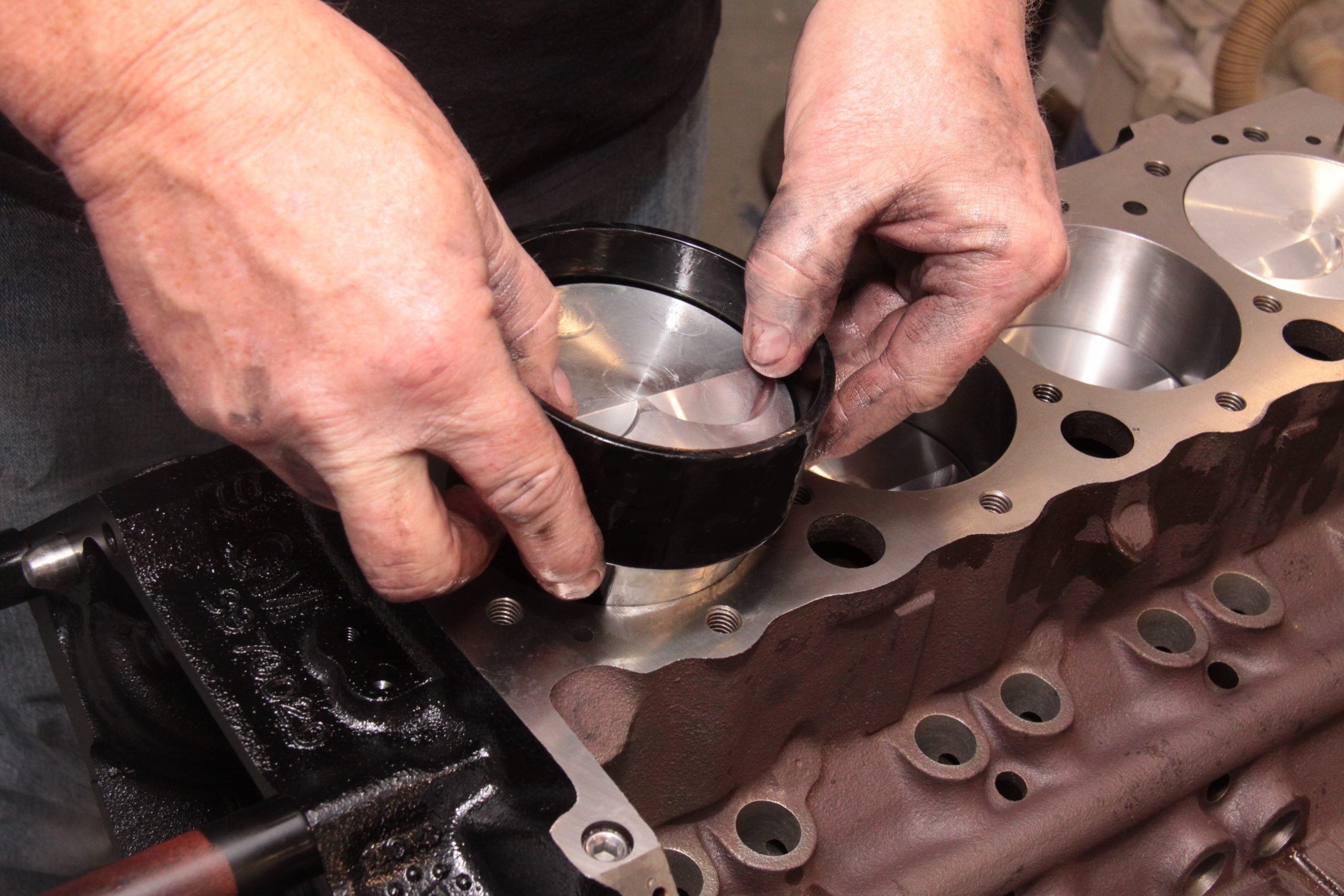 Jeff is using a billet piston ring compressor to assemble the short block. Summit Racing stocks a huge variety of piston ring compressors for your home garage. Billet compressors make more sense for a machine shop. Adjustable compressors are more applicable for home use. (Image/Jim Smart)
