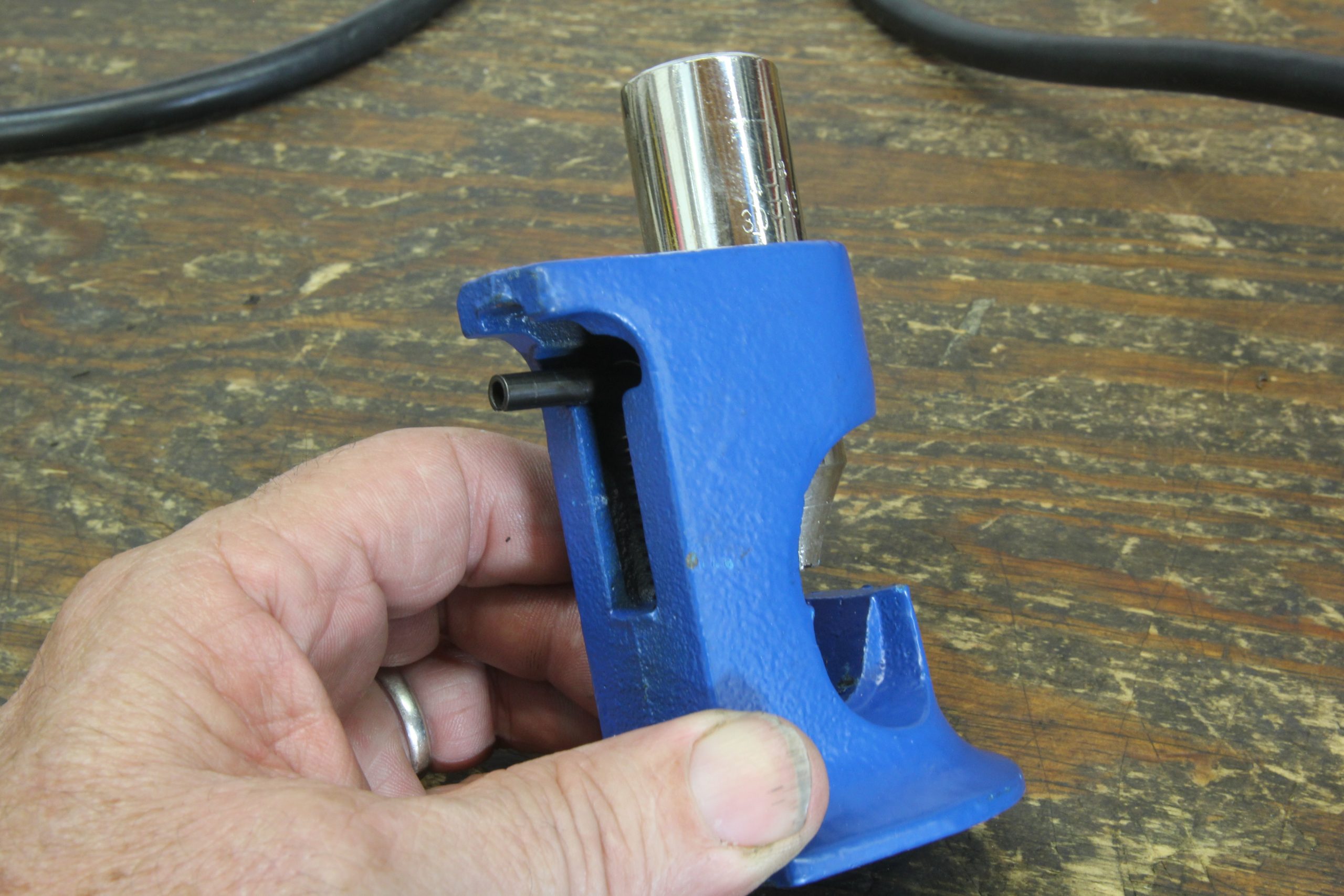 Now strike the top of the tool with a large hammer. This may require more than one hard blow to complete the crimp. It’s best to locate the tool on a solid surface like the edge of a work bench or even a concrete floor. The tool has a small scale on the side of the ram that indicates crimp sizes but we found it hard to read—but it is there if you want to use it.