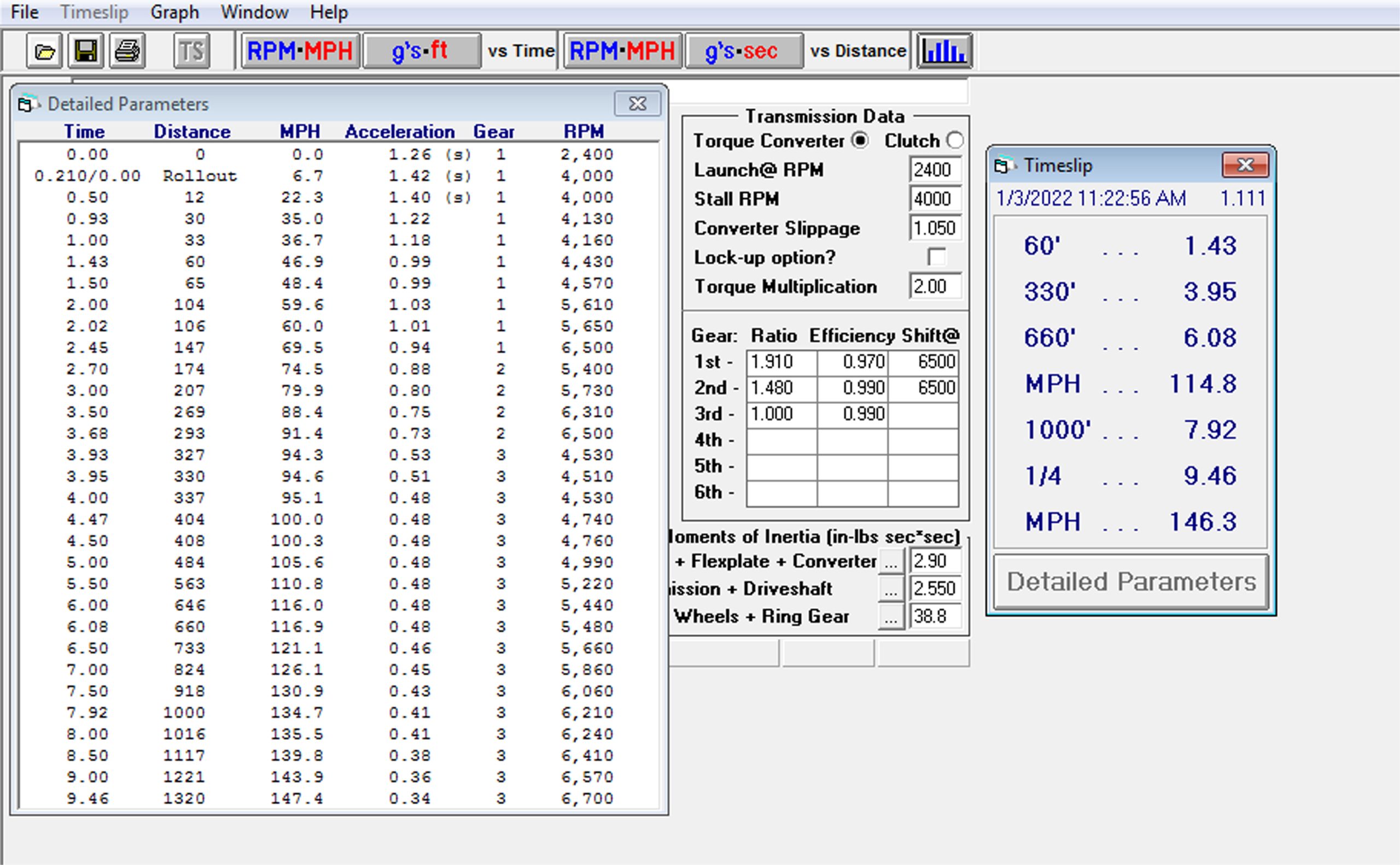 We will save the knowledgeable racers the trouble of deluging us with poison email rants about managing traction. This simulation assumes planting all the power right off the starting line. We are aware of the multiple ways to manage power to allow a small tire car to accelerate with minimal traction. MSD’s slew rate ignition box is one way to control power along with several traction control programs that work extremely well. This could be easily be dealt with by reducing timing at lower engine speeds to manage traction but then why invest in an engine making all this power only to not use it?